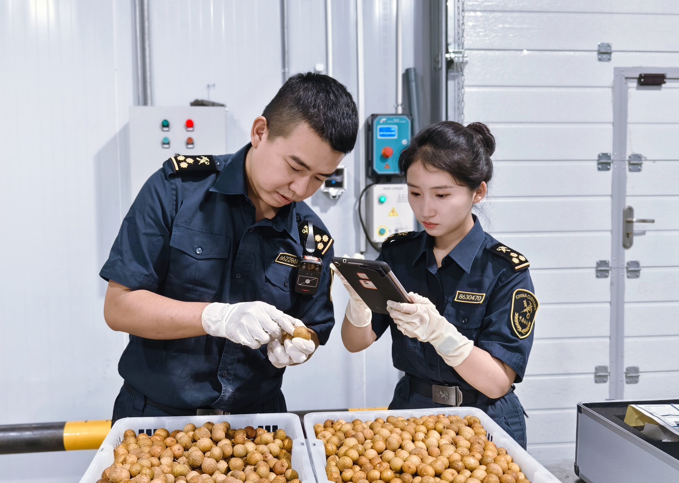 海关关员在磨憨铁路口岸对进口龙眼进行监管。通讯员 赶四 摄