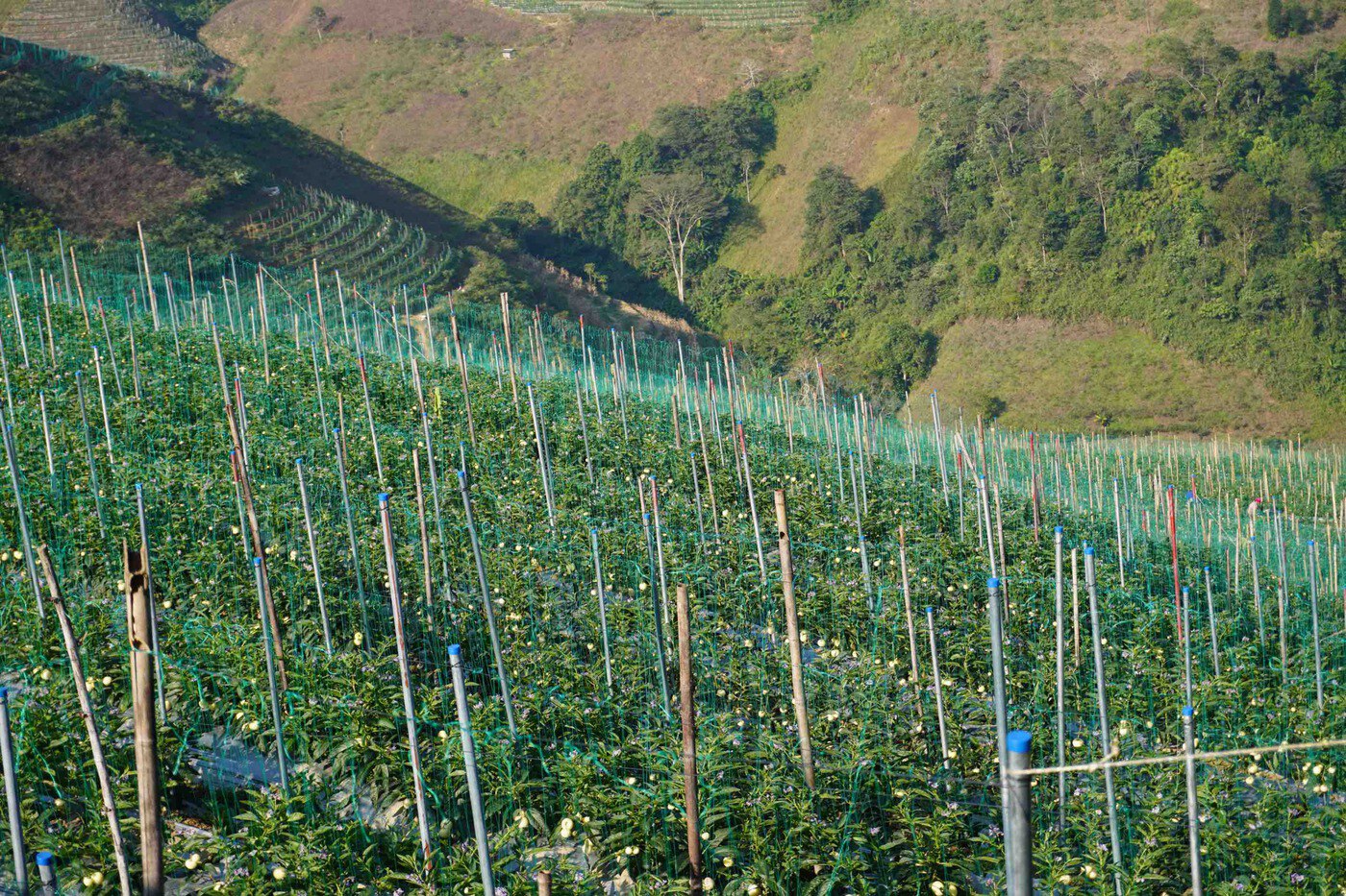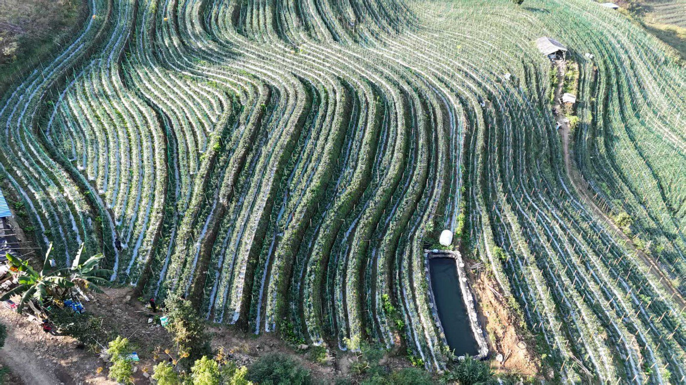 与其它产区人参果多在平地种植不同,金平县的深山里,远远看去,山腰上一片片发光的地块就是人参果种植基地。