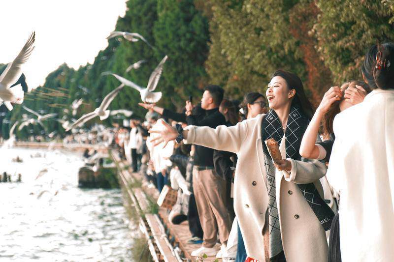 昆明大批游客涌向滇池沿岸邂逅红嘴鸥