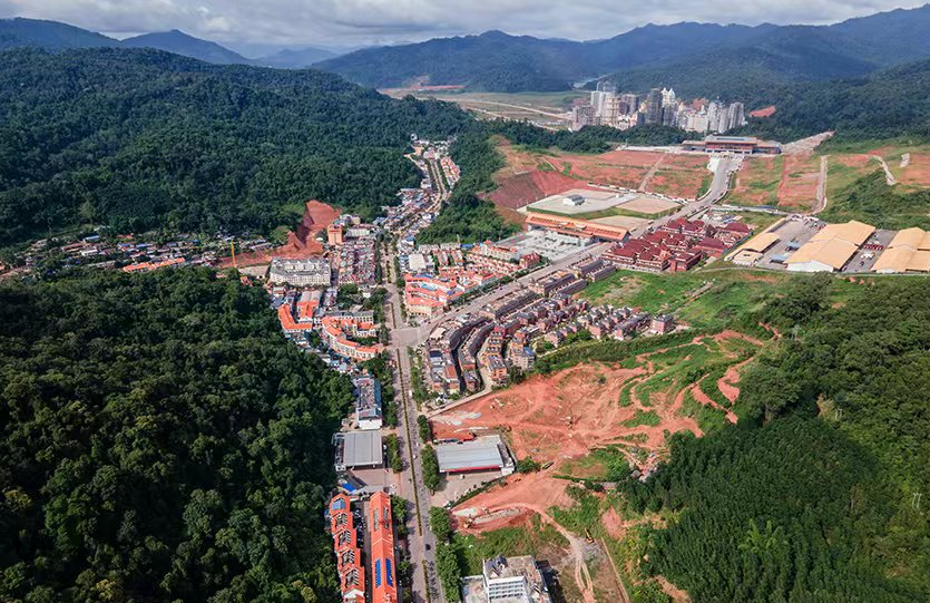 俯瞰磨憨口岸,右前方高层白色建筑群为老挝境内。人民网记者 符皓 摄