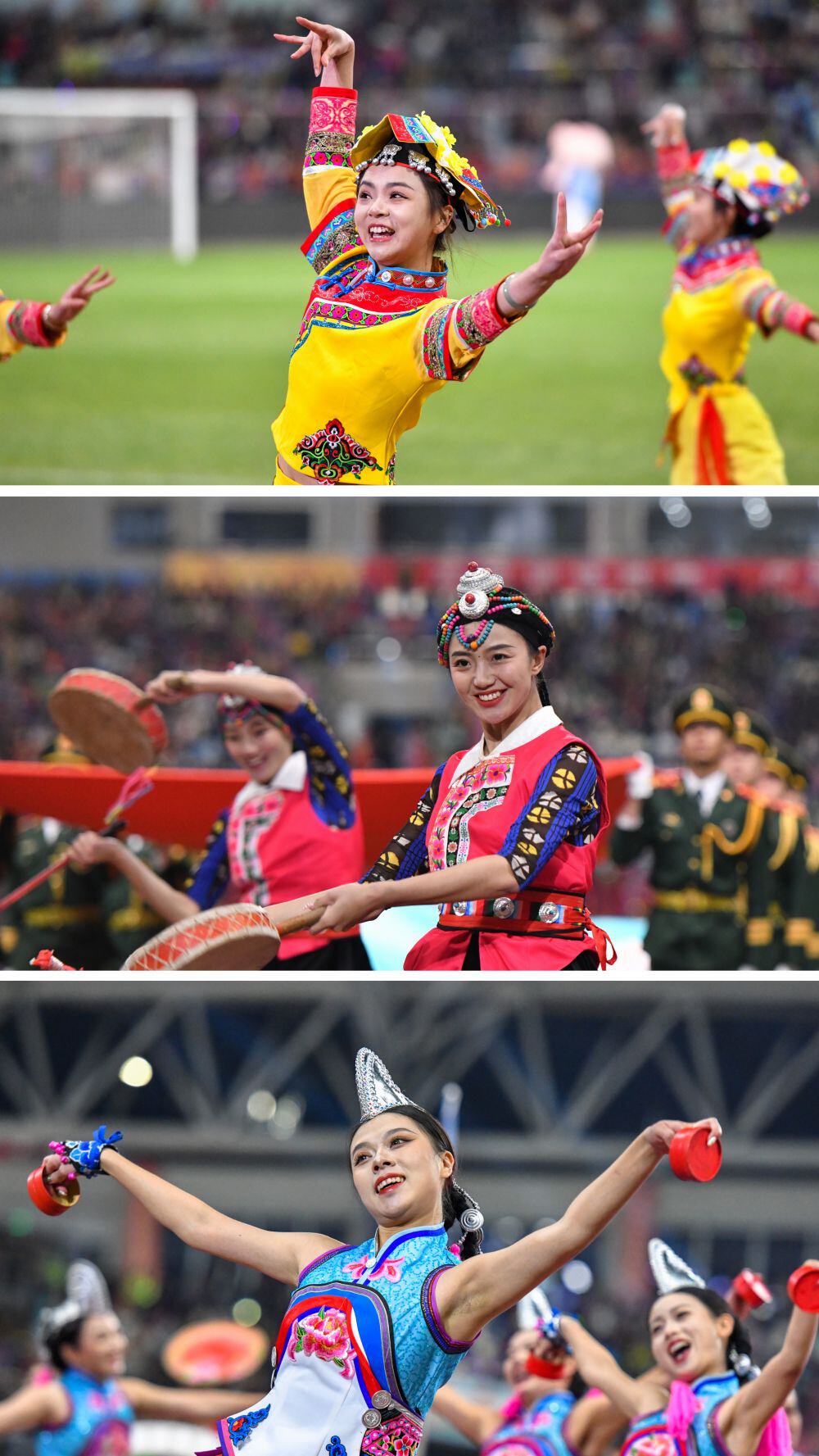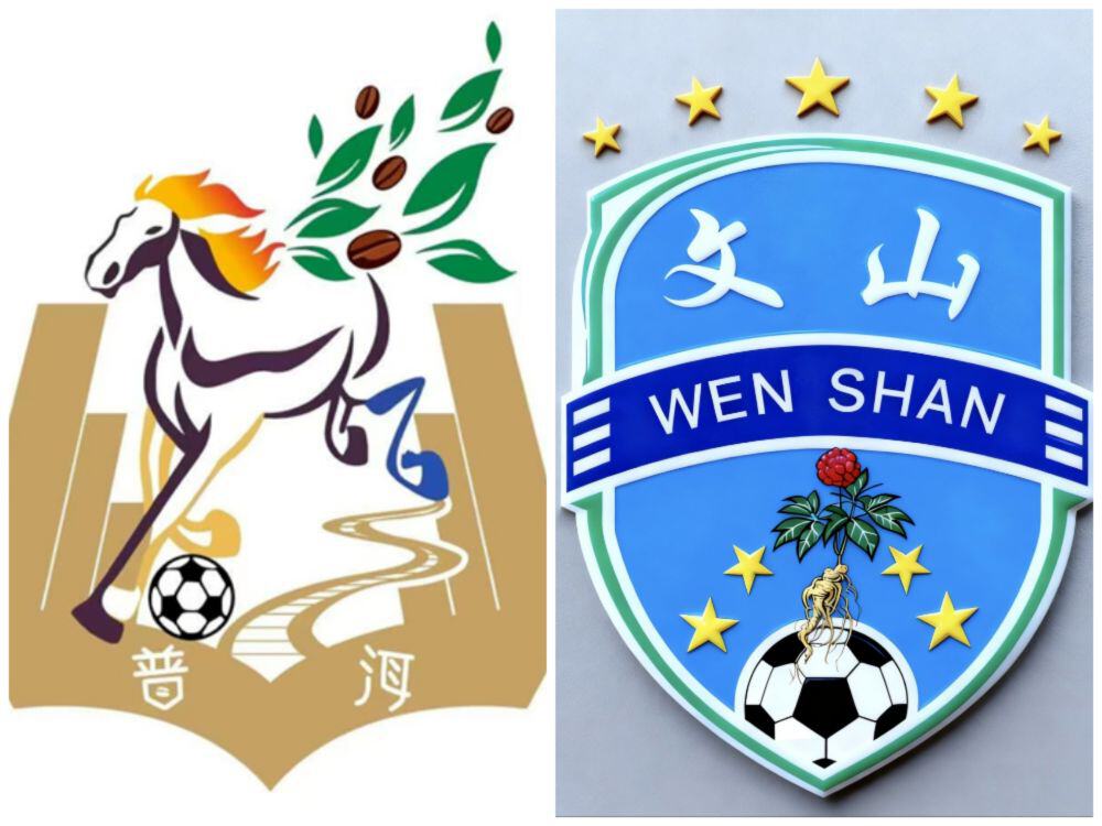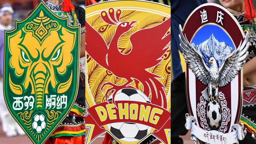 ↑11月29日在“滇超”开幕式上拍摄的西双版纳队(左)、德宏队(中)和迪庆队队徽
