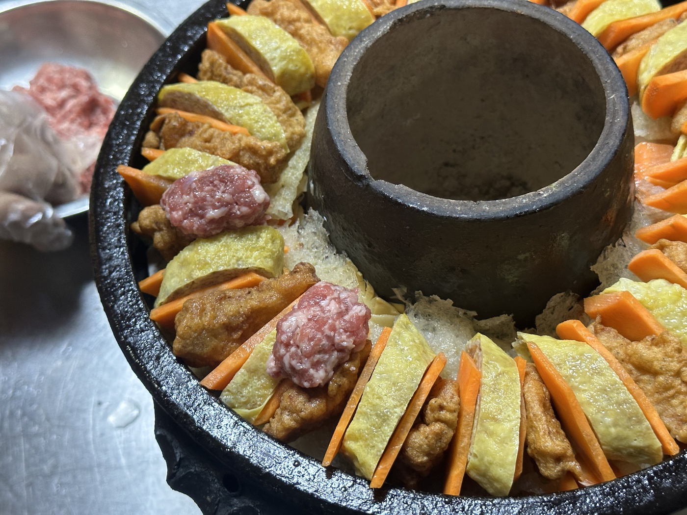 土锅子也称“烀锅子”“暖锅”,用当地陶土烧制的锅子,中间烧着火,周围的汤沸腾着。锅子菜要用腾冲本地的土鸡和猪骨头熬成汤,层层铺上酥肉、青菜、芋头等十几种食材,慢火煨煮数小时。