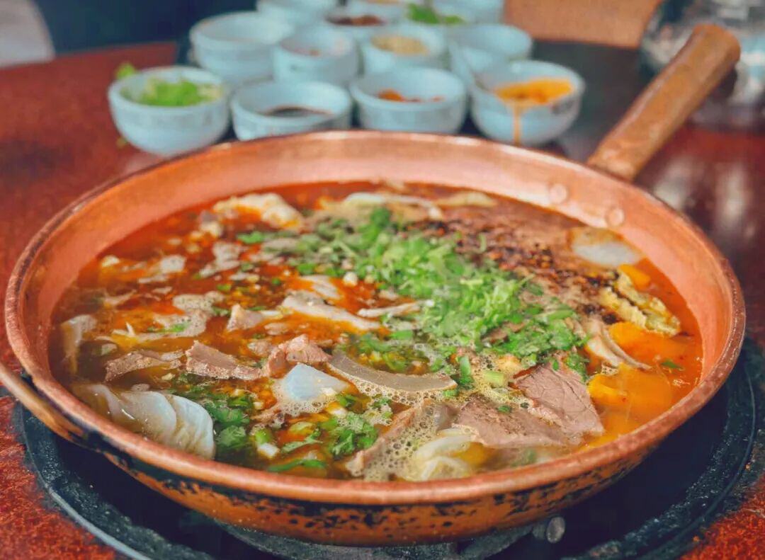这道源于茶马古道马帮的菜肴,如今是腾冲人冬日必备。以炭火铜瓢为器,选用肥瘦适中、嫩滑带皮的牛肉,用老式风炉烧炭加热。当鲜红的汤底沸腾,加入土豆、青菜、莴笋,入口肉质鲜嫩、鲜香浓郁,忍不住米饭多吃一碗。