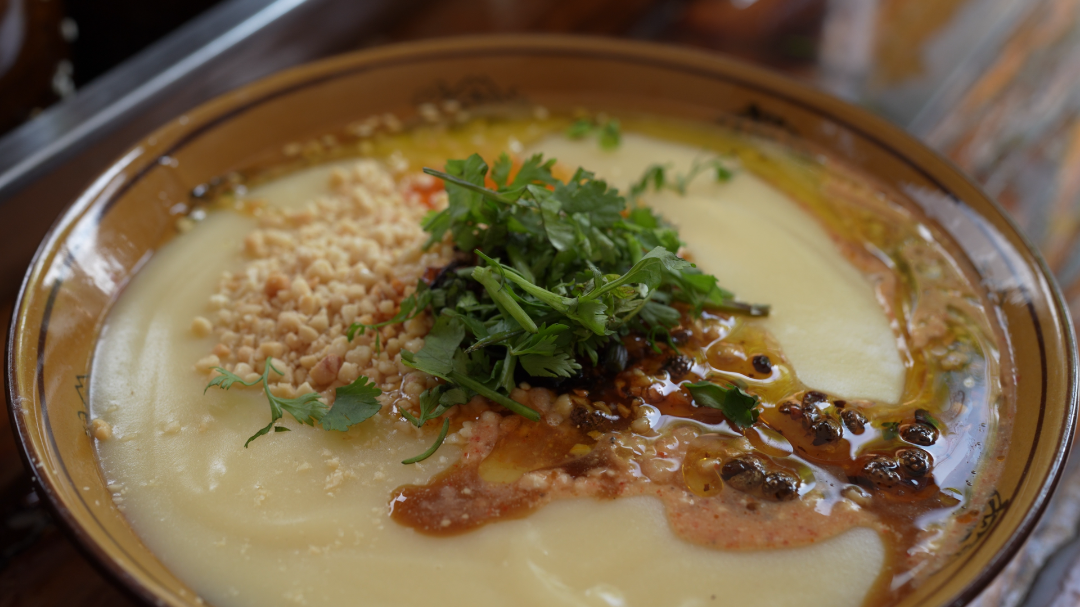 腾冲的早晨,怎么少得了一碗热气腾腾的稀豆粉饵丝?稀豆粉是用豌豆磨浆熬成糊状,铺在烫熟的饵丝上,再佐以十多种调料。搅拌后,每根饵丝都被厚厚的稀豆粉包裹,一口下去,豆香、葱香、油香扑面而来,浓稠细滑、层次丰富的口感让人欲罢不能。