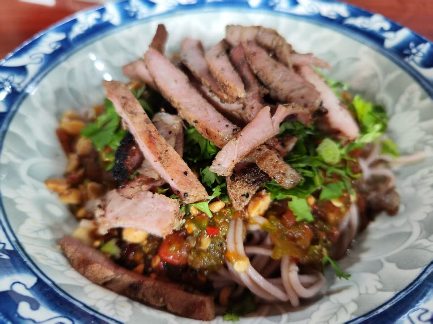 将五花肉用炭火烤得外焦里嫩,烧好的西红柿、辣椒烤熟后剁碎制成的酸辣可口的酱汁,再搭配花生碎、香菜,拌入顺滑的米线,一道清爽解腻,别具风味的米线就好了。
