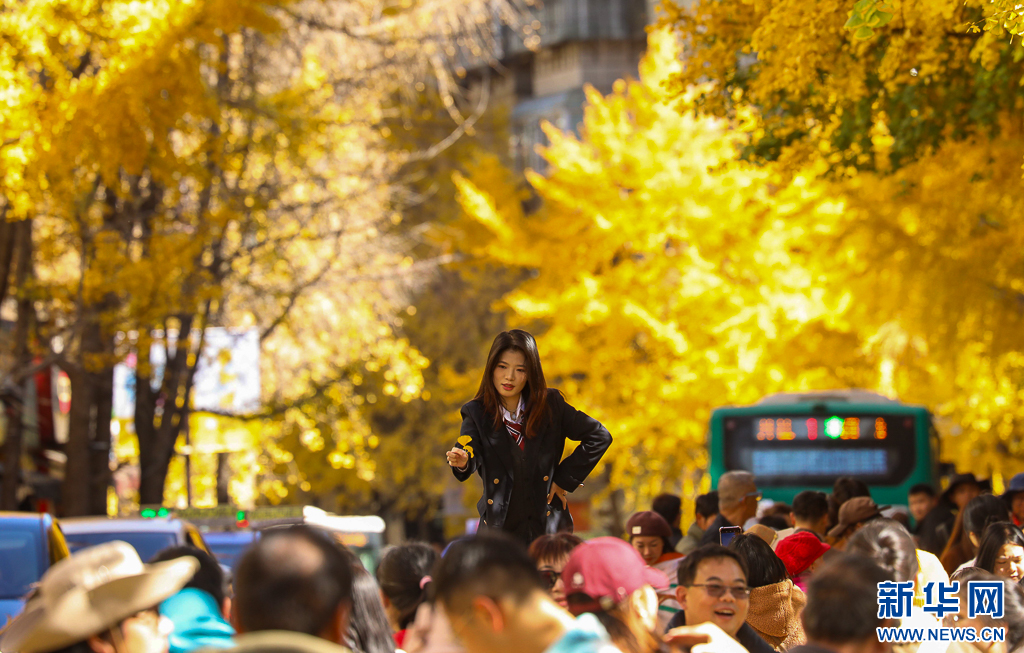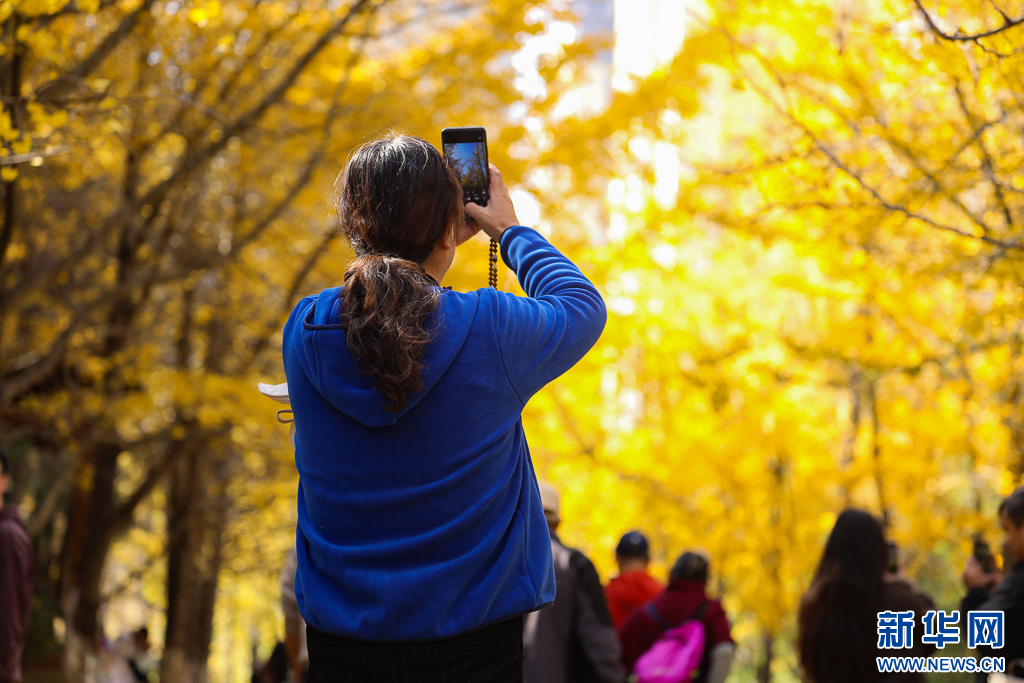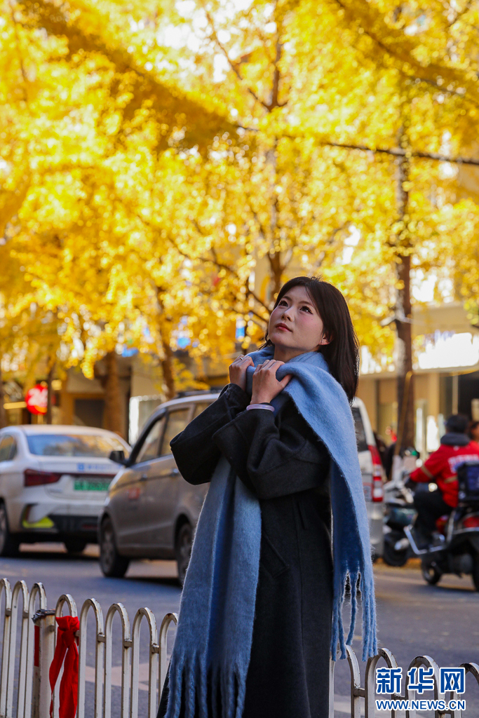 游客在昆明文林街观赏银杏(12月6日摄)。新华网发(郑益 摄)