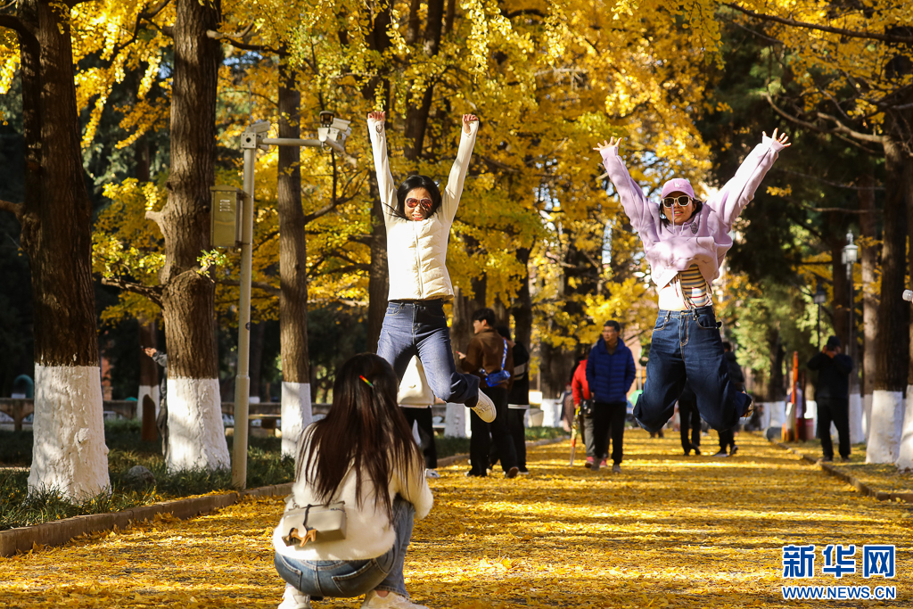 游客在昆明文林街银杏下拍照打卡(12月6日摄)。新华网发(郑益 摄)