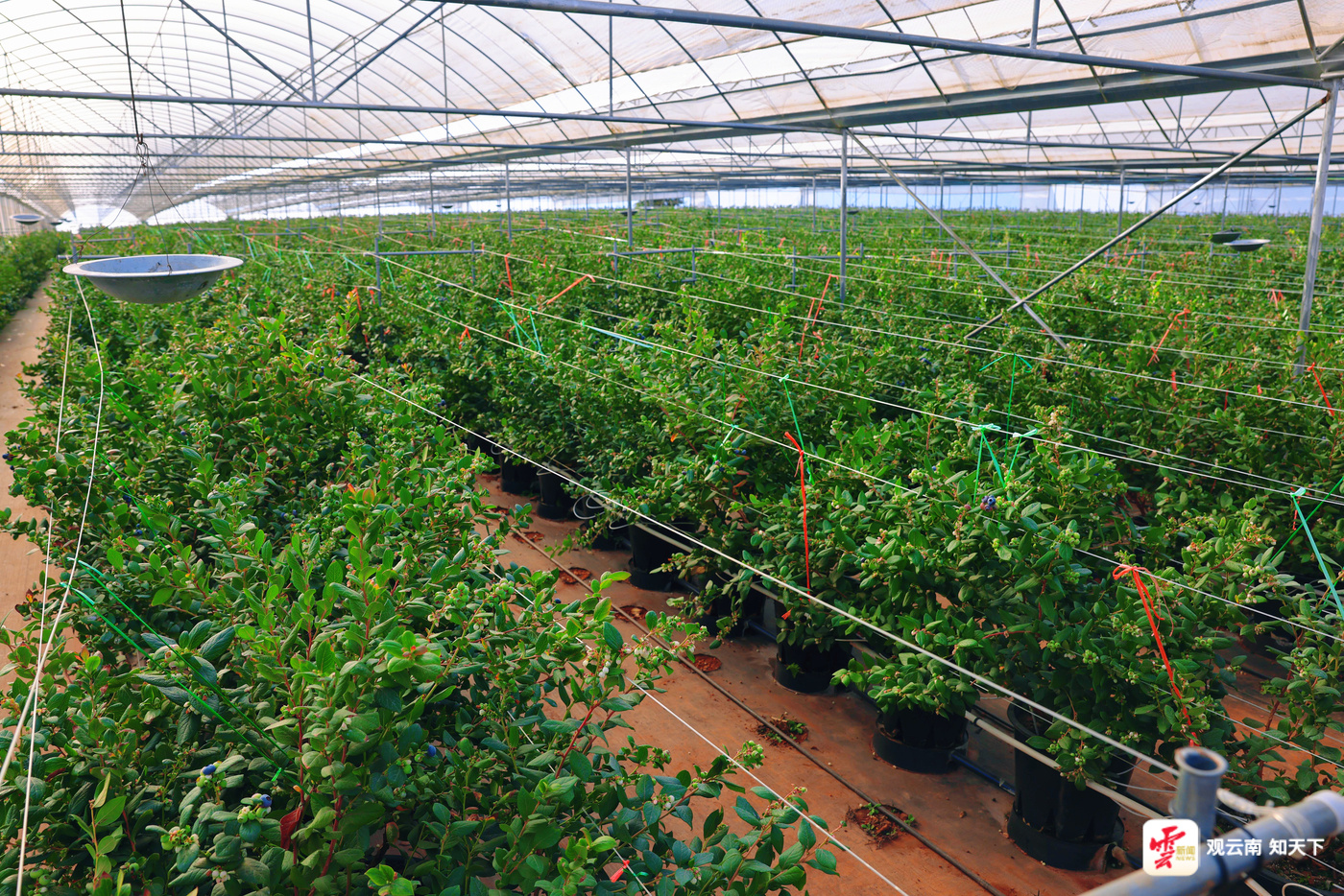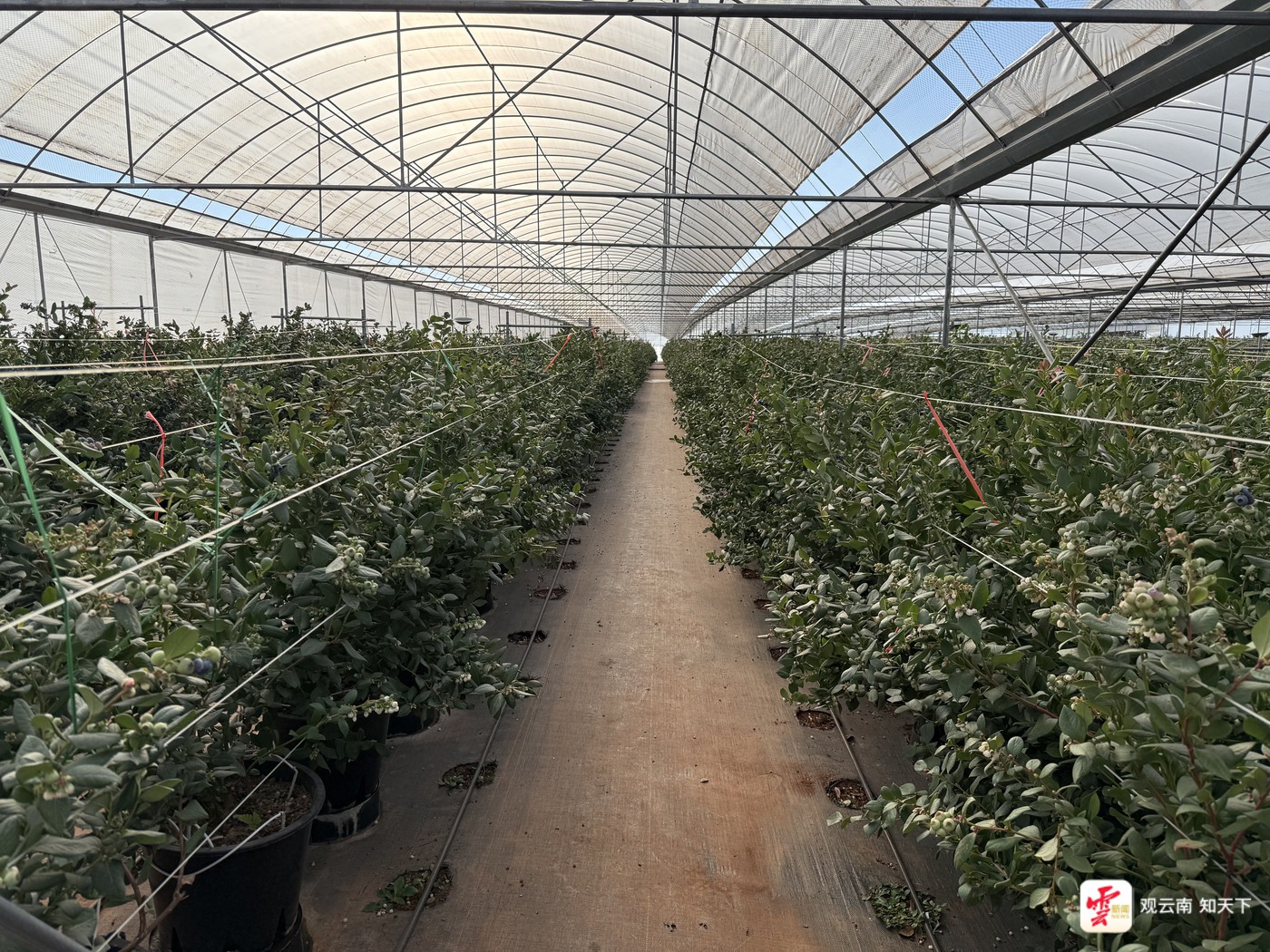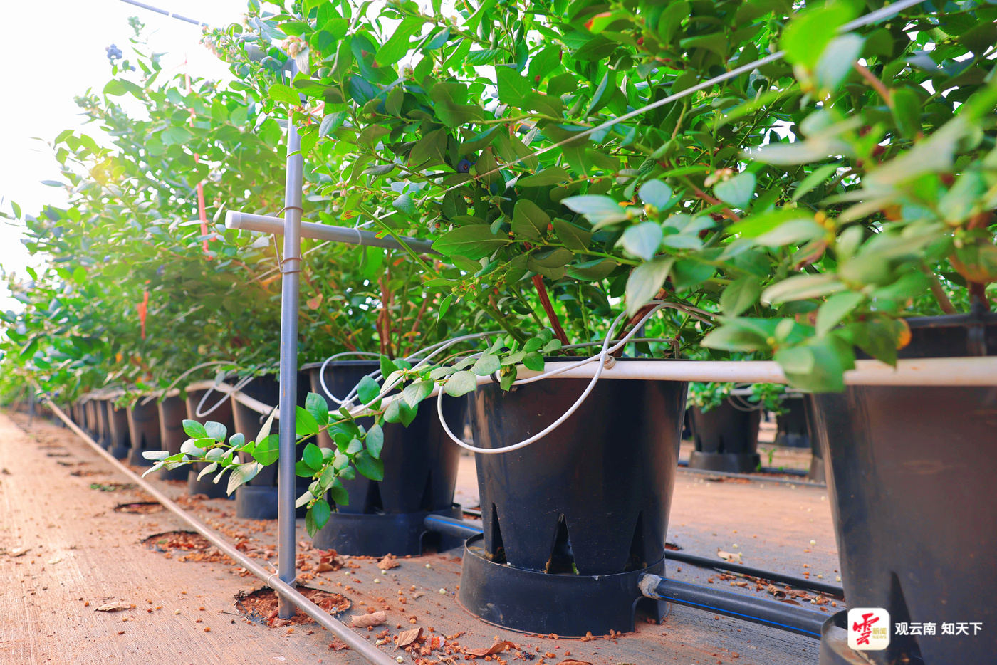 在抚仙湖畔,一片片现代化温室大棚整齐排布,棚内传感器闪烁微光,滴灌系统悄然运行,一盆盆蓝莓植株茁壮生长着。
