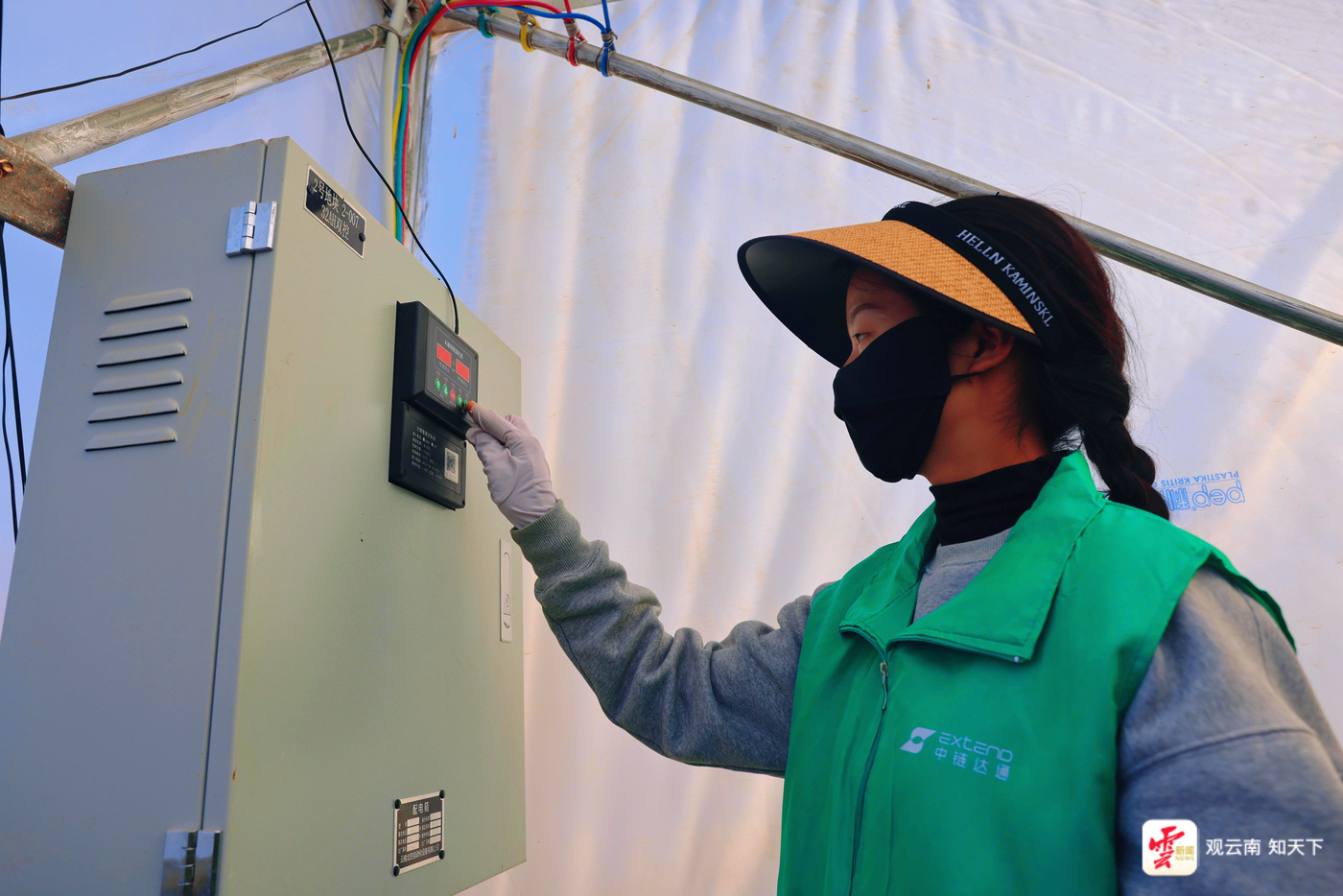 技术人员在操作棚膜一体柜给蓝莓大棚控温。