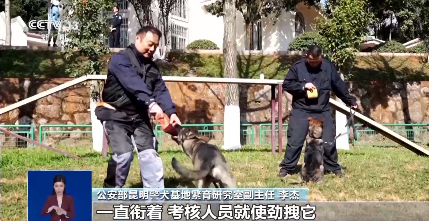 公安部昆明警犬基地繁育研究室副主任 李杰:比如它衔起以后,要看衔得紧不紧,如果衔得不紧,比如衔起来一会儿就吐掉,那肯定分数就不会很高,一直衔着,考核人员使劲拽它,手都拽酸了还不放,分就会高一点。球抛出去,聪明的犬,它定位定得很准,它盯着那个方向转一圈过去了,然后再通过它的嗅觉也好,通过眼睛也好,再仔细地找。