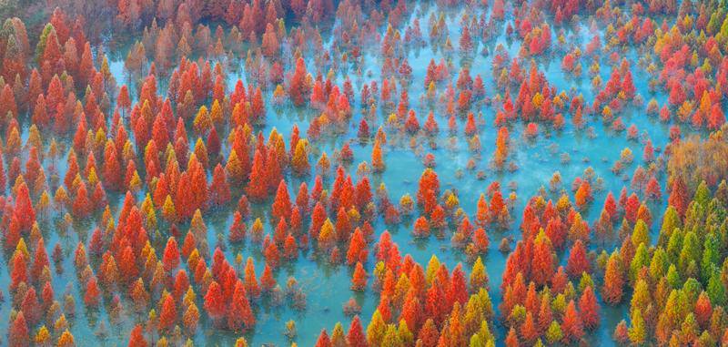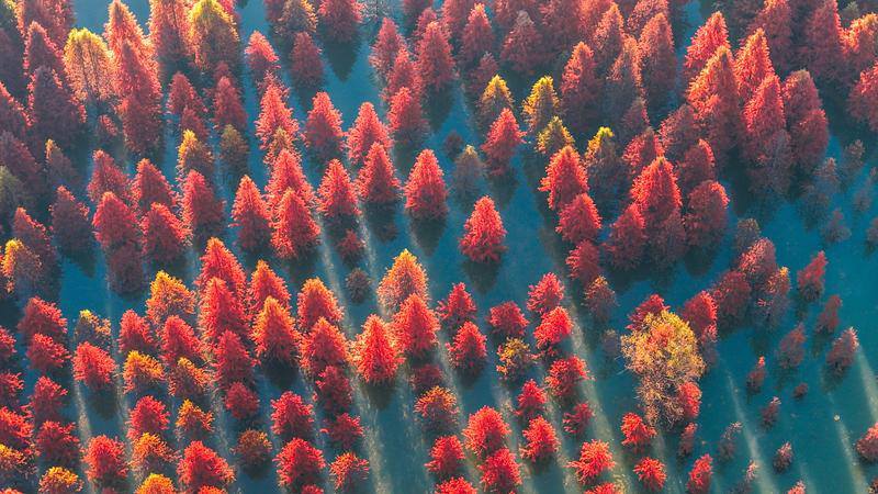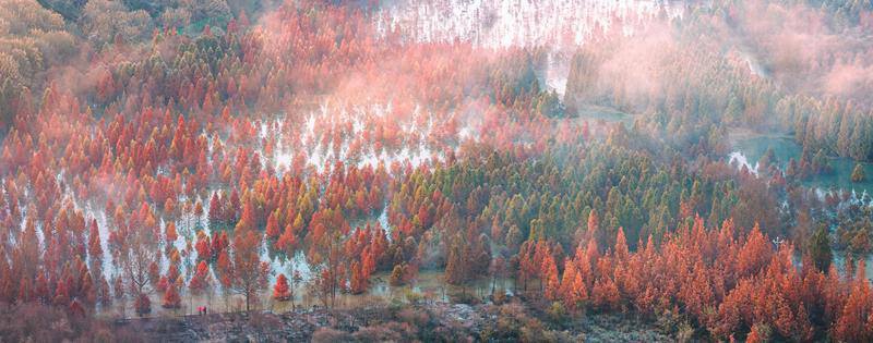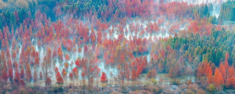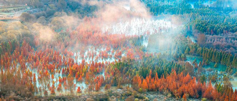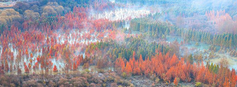 冬日的清晨,昆明市盘龙区滇源街道甸尾村湿地的水杉林色彩斑斓,漫山彩林与云雾交融景色如画。 甸尾村位于滇池上游、昆明松华坝水源保护区内。近年来,当地持续在该区域开展生态修复,通过种植水杉等植物建设林草生物缓冲带,发挥湿地净化水质、维护生物多样性等功能,有效保护了水源地生态环境。