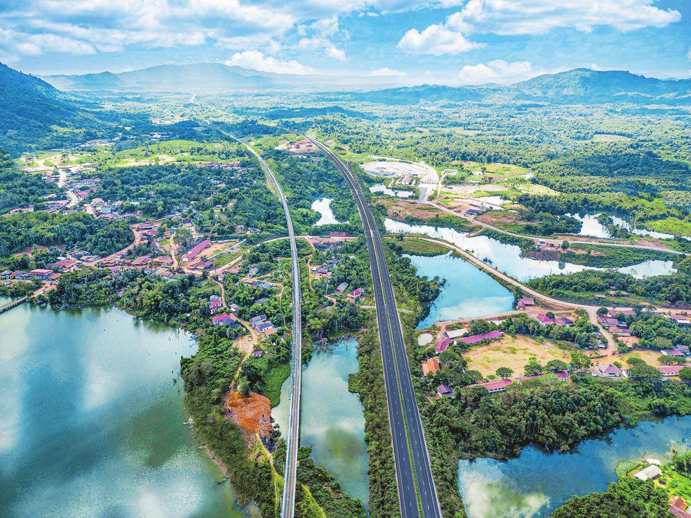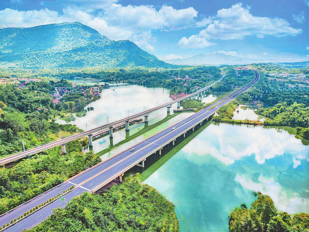 中老高速公路万象至万荣段,山水间路桥舒展,尽显秀美景致。