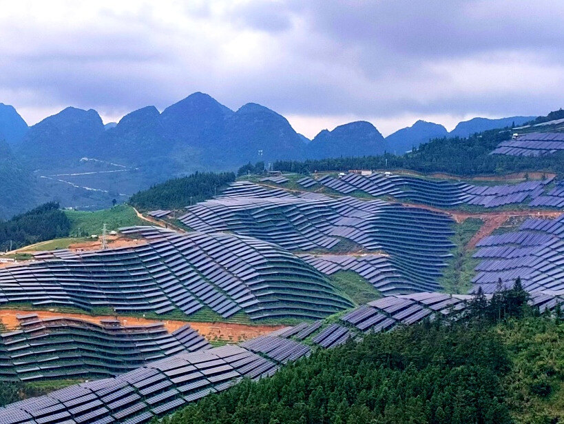 山那头的杨万乡境内,另一场“阳光革命”同样引人注目,者阴山的茶山上,数十万块发电光伏板组成一片“蓝色海洋”。2024年并网发电以来,董干光伏电站项目年发电约1.94亿千瓦时,减排二氧化碳约11万吨,并在光伏板下种植茶叶,形成“板上发电、板下种植”一地两用的新型产业模式。