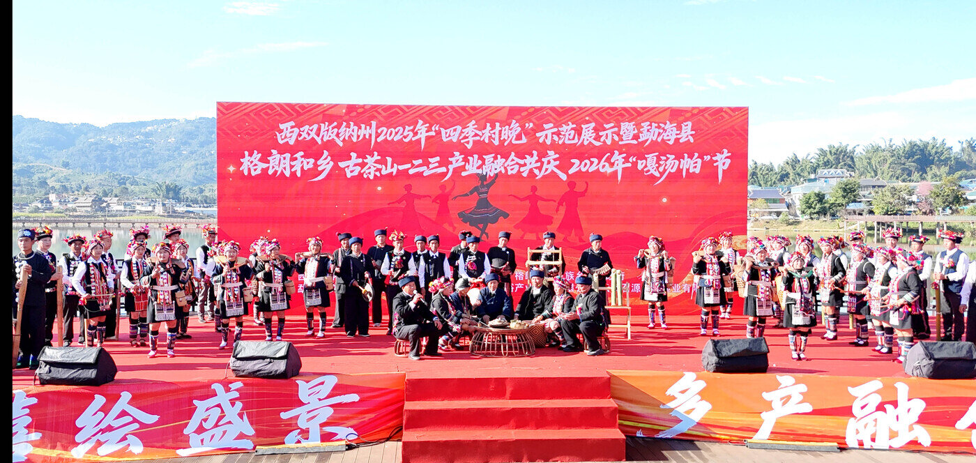 12月30日,西双版纳傣族自治州2025年“四季村晚”示范展示暨古茶山一二三产业融合共庆2026年哈尼“嘎汤帕”节活动,在群山环抱、茶香漫野的勐海县格朗和哈尼族乡举行。