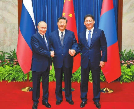 习近平指出,近年来,中俄蒙三方合作稳步发展,取得实实在在的成果。三方合作中期路线图顺利实施,三国贸易额节节攀升,经贸、科技、生态保护、人文合作不断深化。作为山水相连、休戚与共的友好邻邦,中方愿同俄方、蒙方一道,坚守合作初心,排除外部干扰,携手推动三方合作高质量发展。
