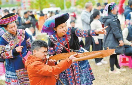 作为花山节的非遗亮点,射弩表演一开场便点燃全场。各地选手握弩、拉弦、击发,动作流畅,精准射术赢得阵阵喝彩。互动体验区更添烟火气。全程开放、零门槛参与,有专人手把手教学,无论老少都能上手。游客们调整拉弦力度、瞄准角度,沉浸式体验苗族传统体育的独特乐趣。