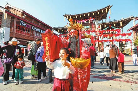 游客在昆明融创文旅城与“财神”合影。 本报记者 陈飞 摄