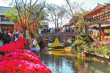 丽江古城鲜花盛开,游客徜徉于青石板路上。 本报记者 陈飞 摄