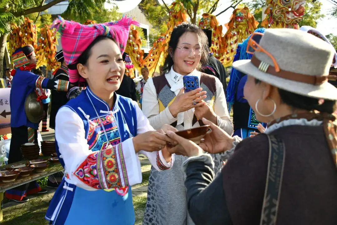“石屏之约·彝家有宴”现场,身着民族服饰的工作人员献上迎宾酒。图据石屏县融媒体中心