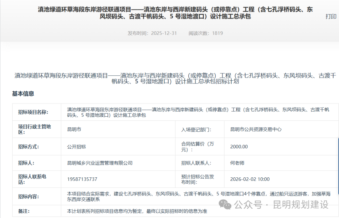 昆明市文旅集团全资子公司昆明城乡兴业运营管理有限公司发布《滇池绿道环草海段东岸游径联通项目——滇池东岸与西岸新建码头(或停靠点)工程(含七孔浮桥码头、东风坝码头、古渡千帆码头、5号湿地渡口)设计施工总承包》招标计划,计划在滇池草海新建4个游船停靠点。