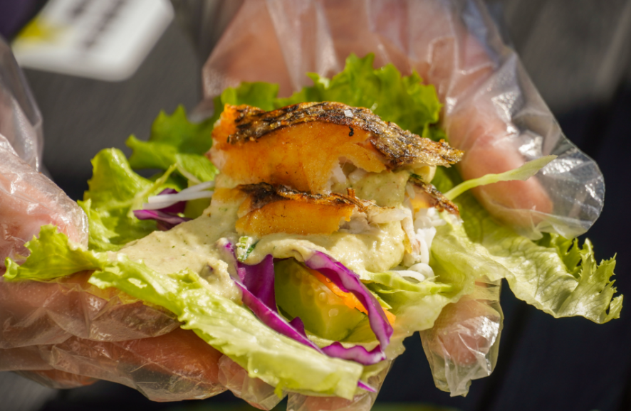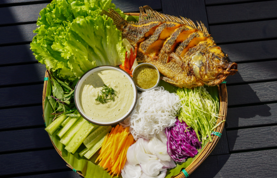生菜裹着酥鱼、米线和配菜