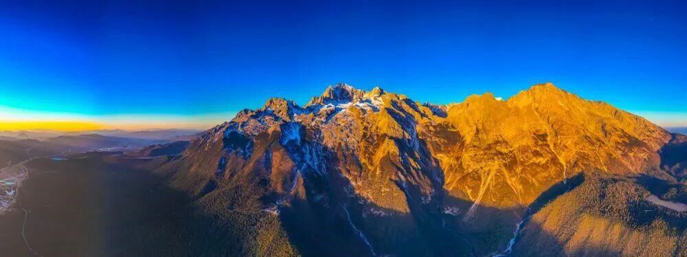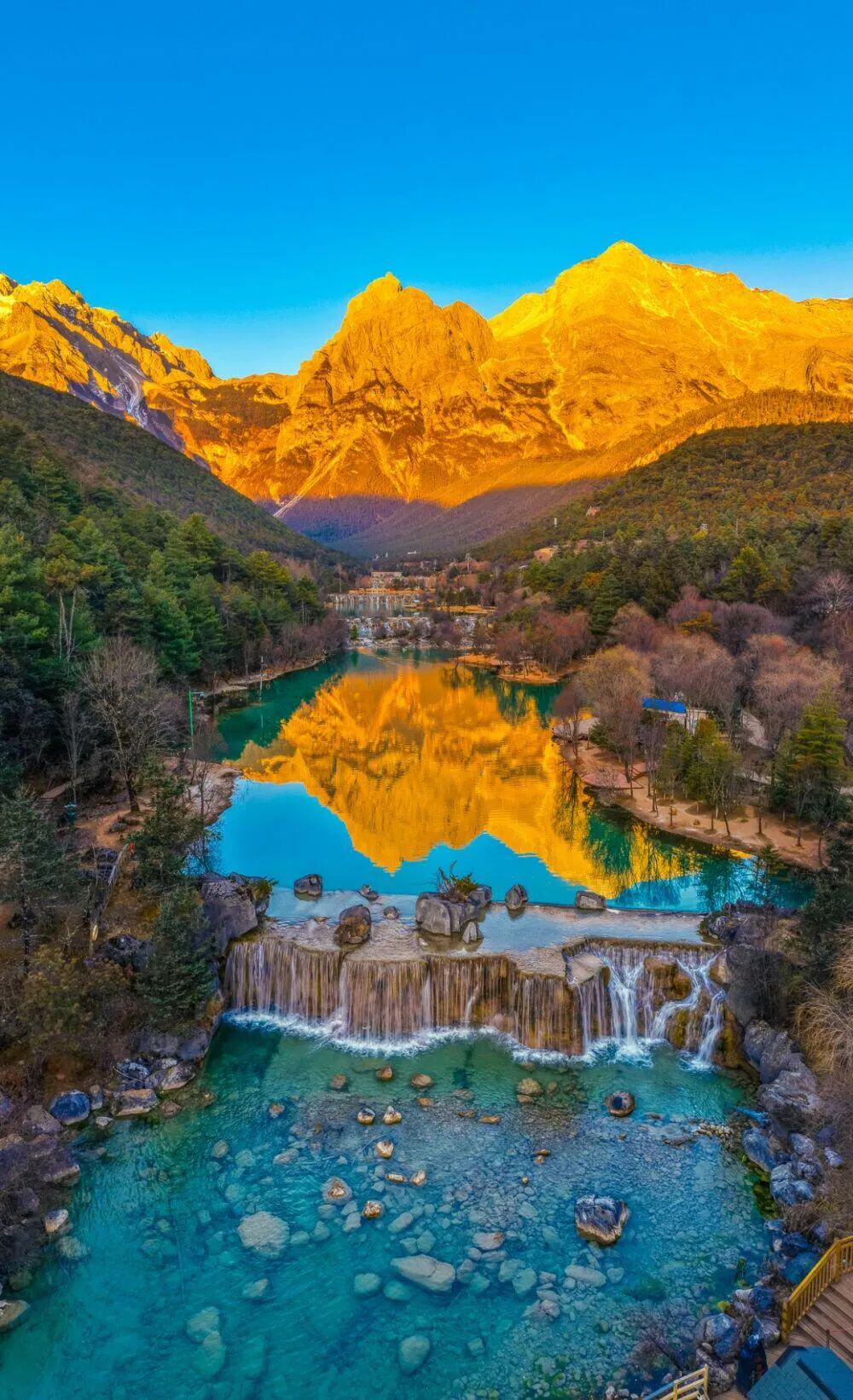 当清晨第一缕阳光穿透云层,海拔5590.2米的雪域峰峦被瞬间“点燃”。皑皑白雪身披万丈金光,宛如一条金色巨龙盘踞云端,巍峨壮丽。视线向下,蓝月谷的湖水如蓝宝石般静谧深邃,将燃烧的“金山”揽入怀中。山巅是烈焰般的辉煌,湖面是沁人的蔚蓝,飞瀑流泉与雪山同框,冷暖色调在大自然笔下完美交融。