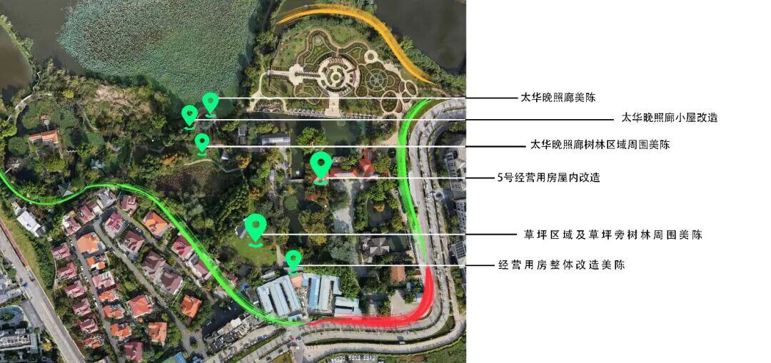 本次改造区域为庾园内庾园5号馆、太华晚照廊区域、舞台草坪旁管理用房(具体范围详见下图),包括但不限于景观步道、休憩设施及部分绿化区域。施工期间,该区域将全封闭围挡,暂停对外开放。