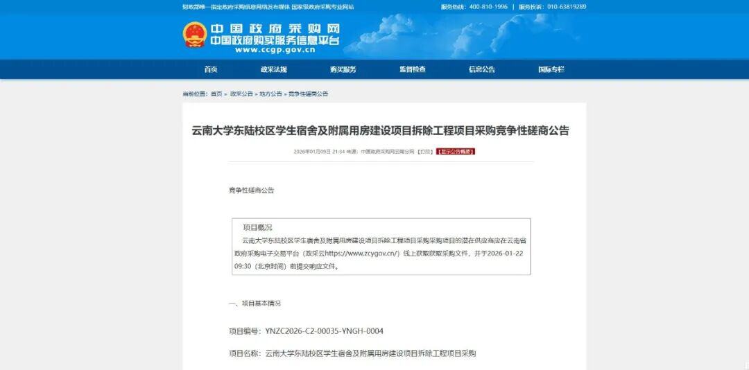 公告还透露,中标者需在采购方云南大学发布工作任务后的35天内完成拆除工作,同时配合完成后续施工环节的衔接工作。