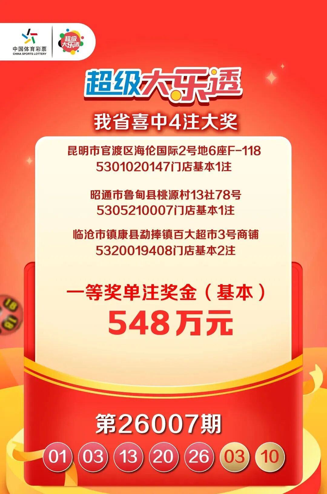 原标题:548万×4!云南一天内喜中4注大奖,恭喜昆明、昭通、临沧的彩民!