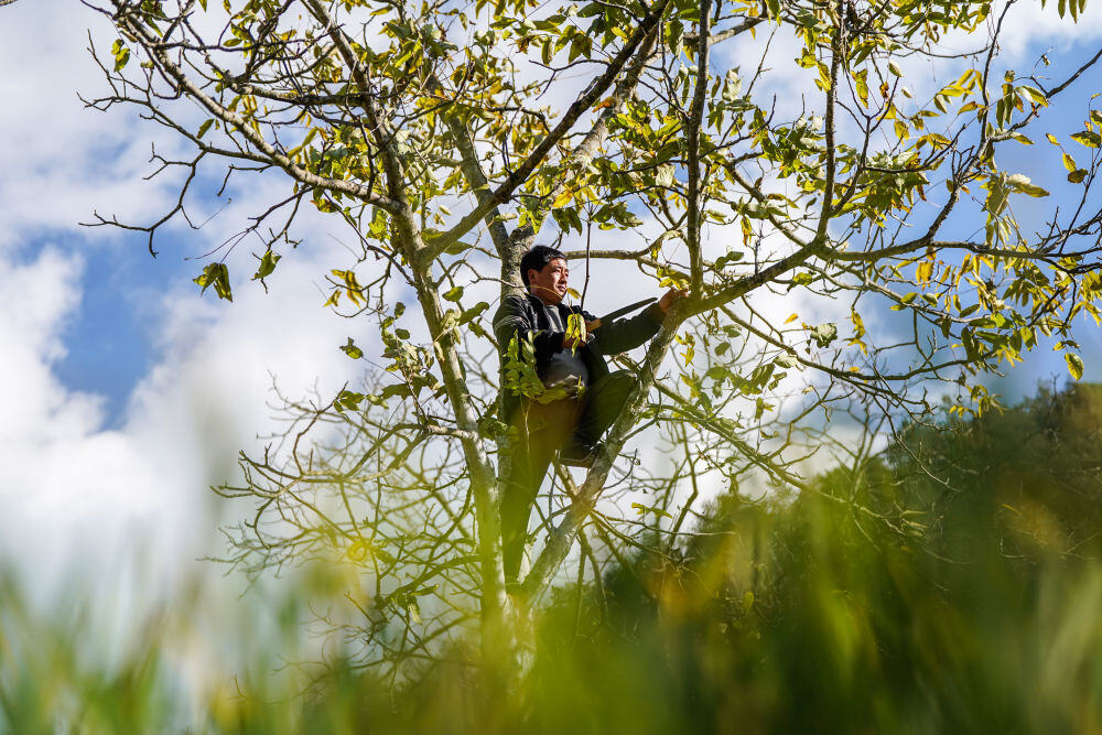1月6日,临沧坚果产业发展带头人毕家富在临沧市永德县的一片坚果树林修剪坚果树枝丫。新华社记者彭奕凯 摄