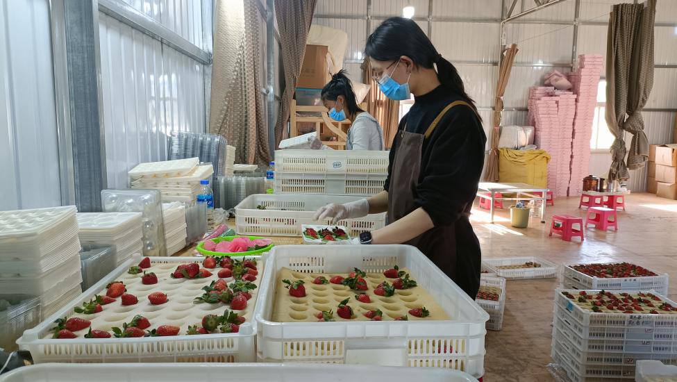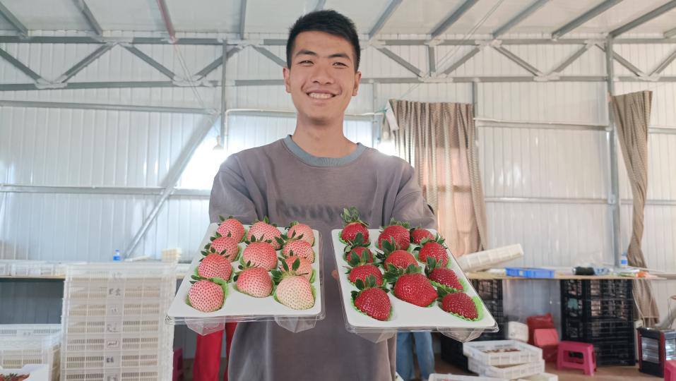 种植户周鹏振手里拿着粉草莓、黑草莓。李春丽 摄