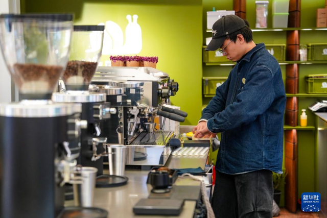 1月27日,在昆明大观篆新农贸市场的一家咖啡店里,咖啡师在制作咖啡。新华社记者 陈欣波 摄