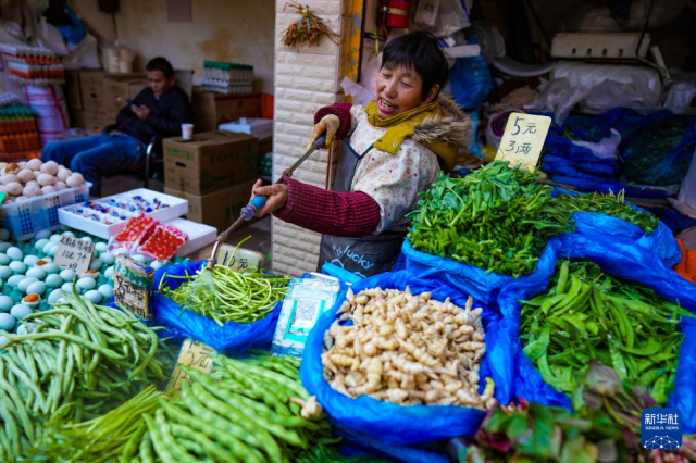 1月27日,在昆明大观篆新农贸市场,摊主在整理蔬菜。新华社记者 陈欣波 摄