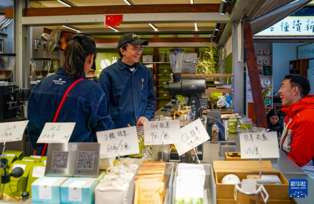1月27日,在昆明大观篆新农贸市场的一家咖啡店里,咖啡师(左二)和游客交流咖啡文化。新华社记者 陈欣波 摄
