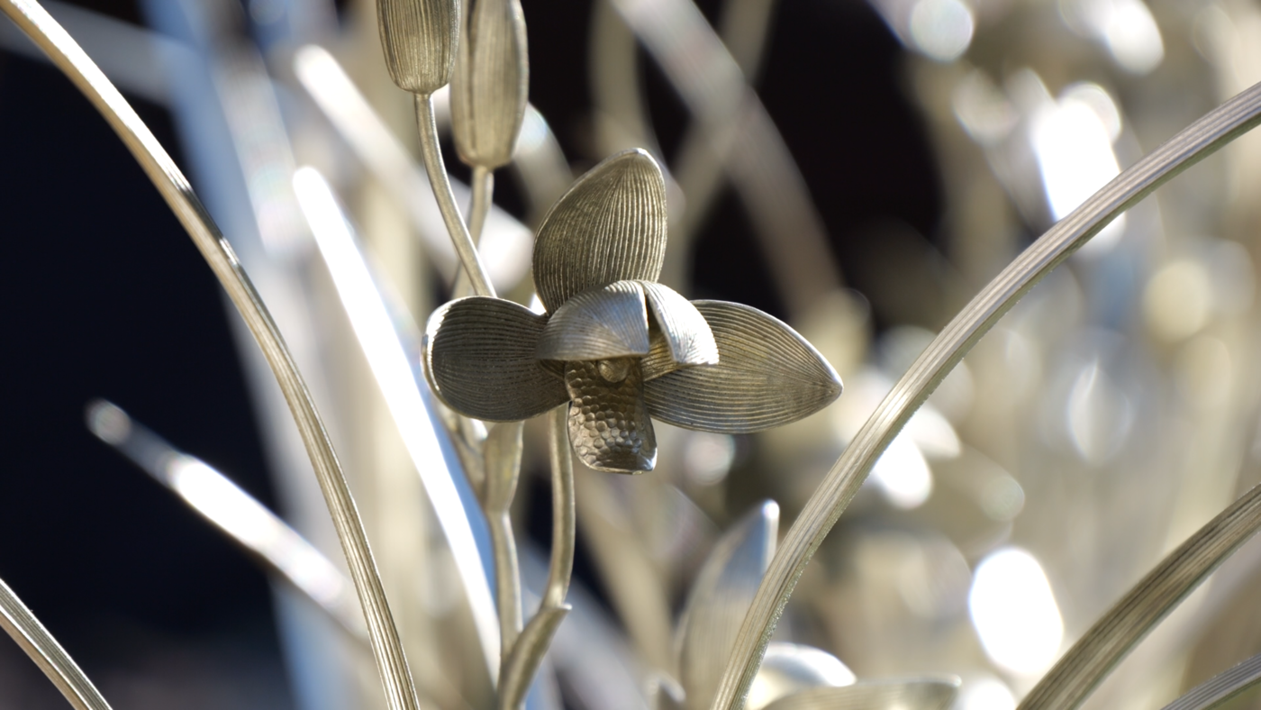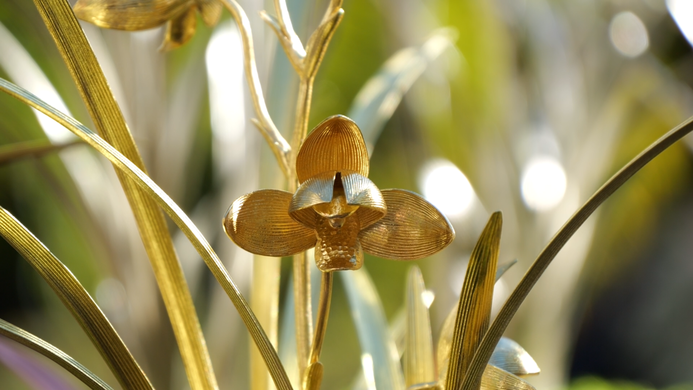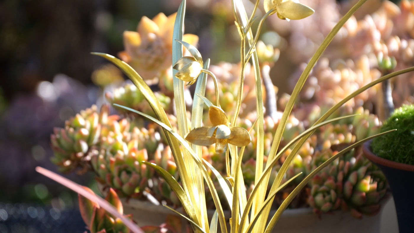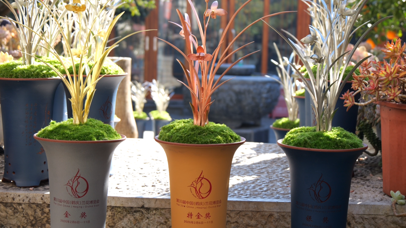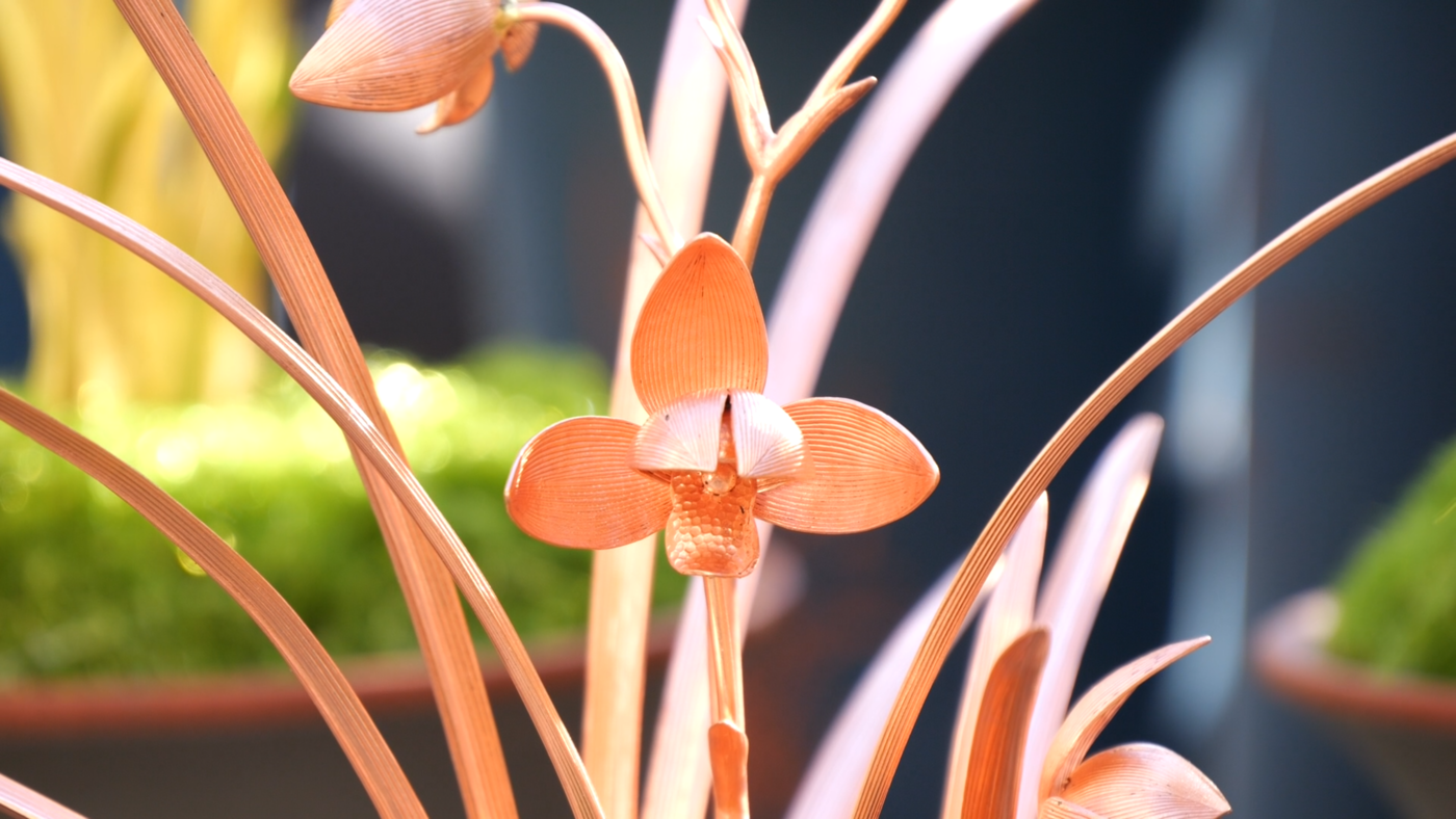 鹤庆银器锻制技艺省级非遗代表性传承人李树坤说:“特金奖我们选用的是紫铜的材质,金奖是选用了黄铜的材质,银奖是用了白铜。一个人工三天时间才能做出来一盆,我们组织了十几个人,一直从早到晚,每天都在赶制。制作比较难的一点,就是要把兰花叶片上的脉络,还有它的神态,花开的形状,都要和真实的兰花做到非常接近。”