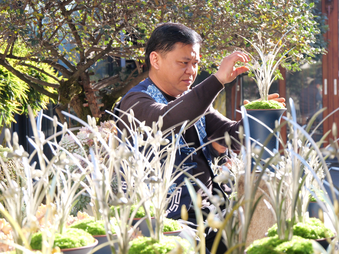 第33届兰花博览会开幕前夕,记者来到鹤庆银器锻制技艺省级非遗代表性传承人李树坤工坊,看到工坊内摆满了他为第33届兰花博览会设计制作的奖品——一盆盆栩栩如生的银铜兰花。