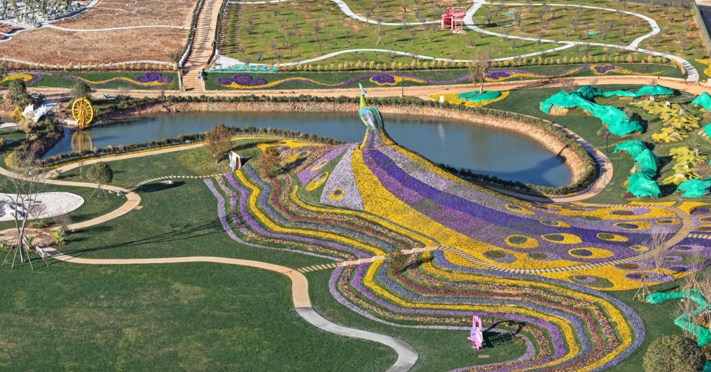 在滇池东岸,一幅生态画卷正徐徐展开——5万盆鲜花织成了一只身姿优雅的巨型孔雀。作为昆明第二大孔雀造型花坛,它静立于湖畔,与滇池的湖光山色相映成趣。蝴蝶与蜜蜂造型的花带环绕其间,宛如春风途经时不经意洒落的绚烂笔触;从高空俯瞰,整幅景观恰似一幅流动的彩色织锦,在滇池畔静静铺展着属于春城的盎然诗意。