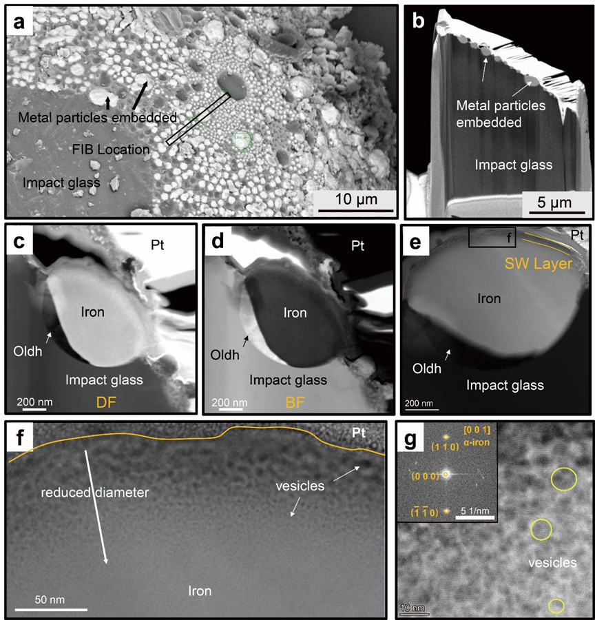 月壤撞击玻璃镶嵌金属颗粒的FIB切片图像与褐硫钙石(Oldh)赋存位置。
