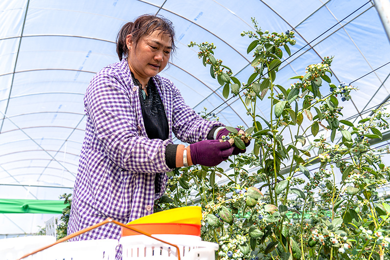 工人正在采摘新鲜蓝莓果实。陈超摄