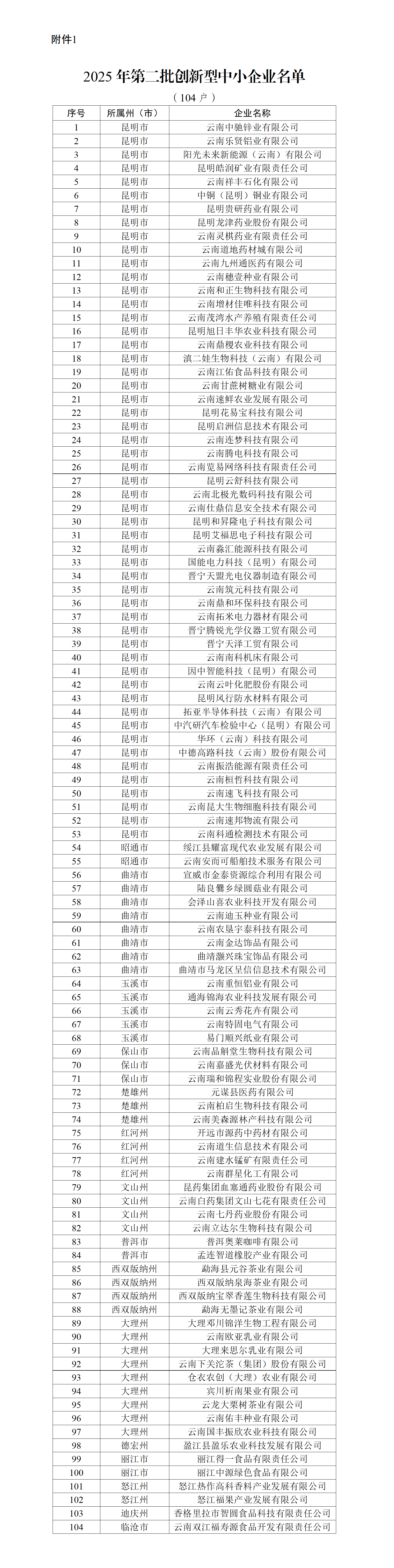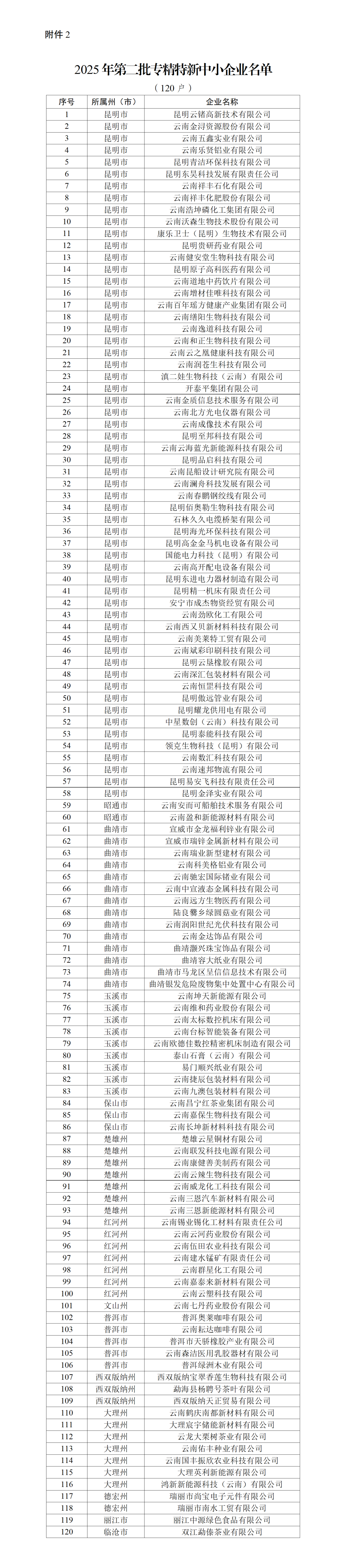 云南省工业和信息化厅近日公布2025年第二批创新型中小企业、专精特新中小企业名单,授予云南中驰锌业有限公司等104户企业创新型中小企业称号,授予昆明云锗高新技术有限公司等120户企业专精特新中小企业称号。