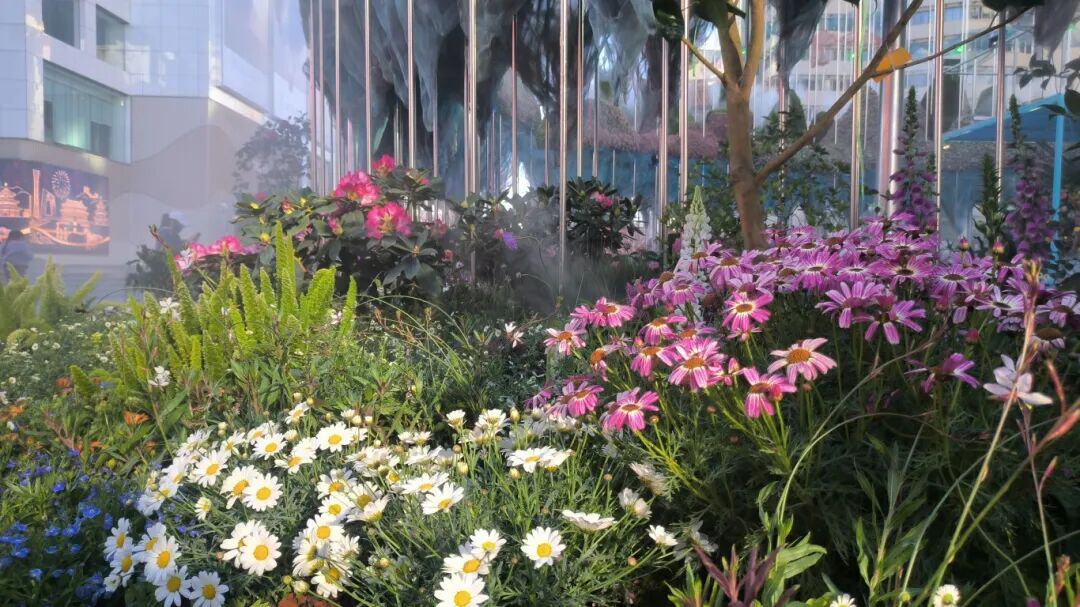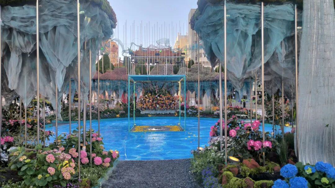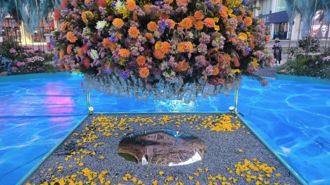 走进花雕,可以看到不锈钢镜面骨架的支撑,如快速发展中的昆明,高楼林立,日新月异的新景象。上层空间七彩祥云及轻柔飘带,让所有到访的人都能享受昆明这吉祥的景象,山脊嵌装雾森系统,融合鲜活苔藓及萌萌多肉植物,晨问薄雾缭绕,倒影山间,像极了植物王国应有的生态系统。呼应“五百里滇池奔来眼底”的烟波浩渺,形成“山映水水载山”的沉浸生态场景。