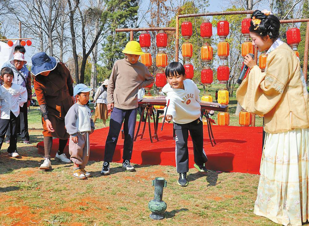 大年初二,孩子们在昆明福保半岛国风游园会上玩投壶游戏。本报记者 黄兴能 陈飞 摄