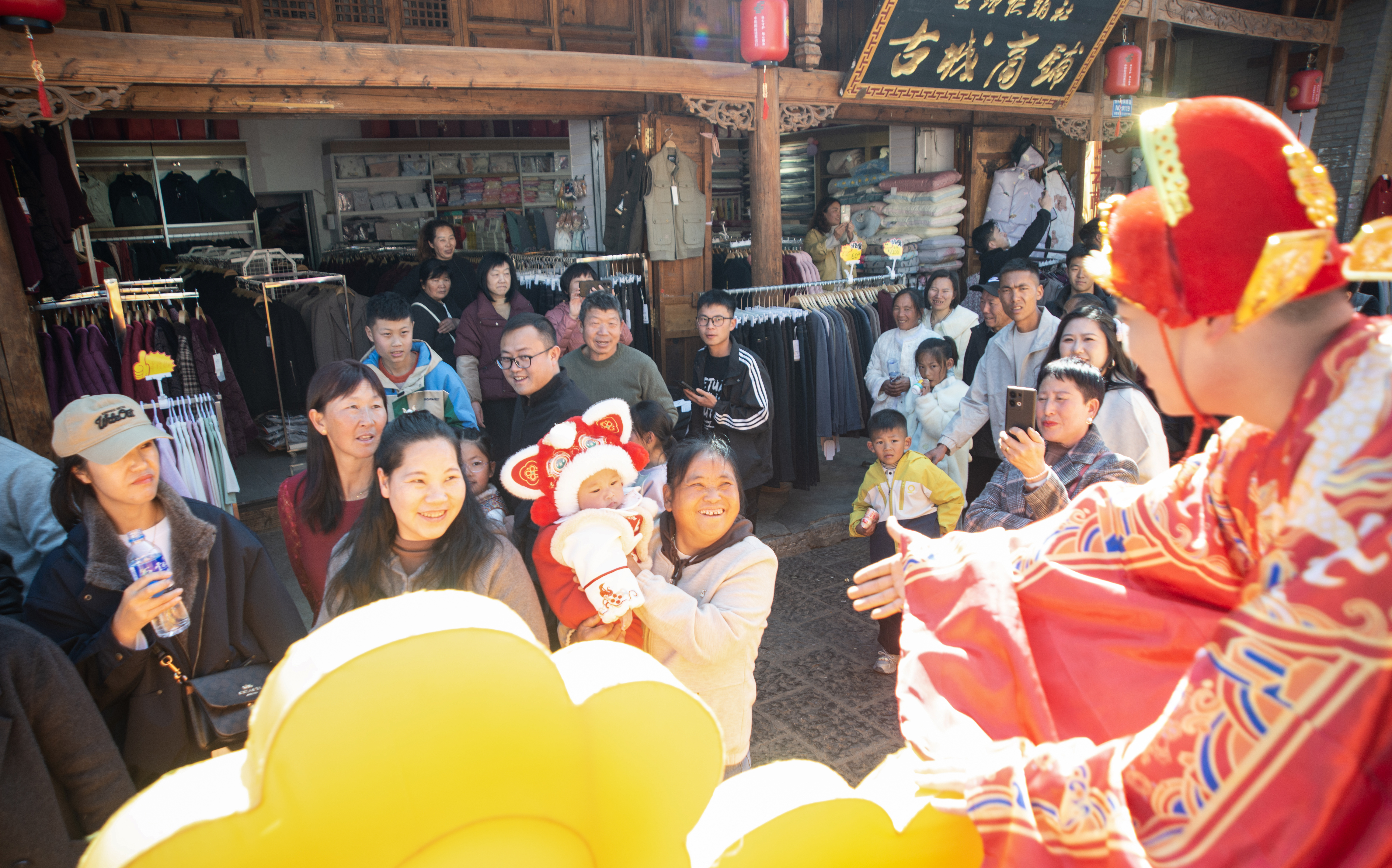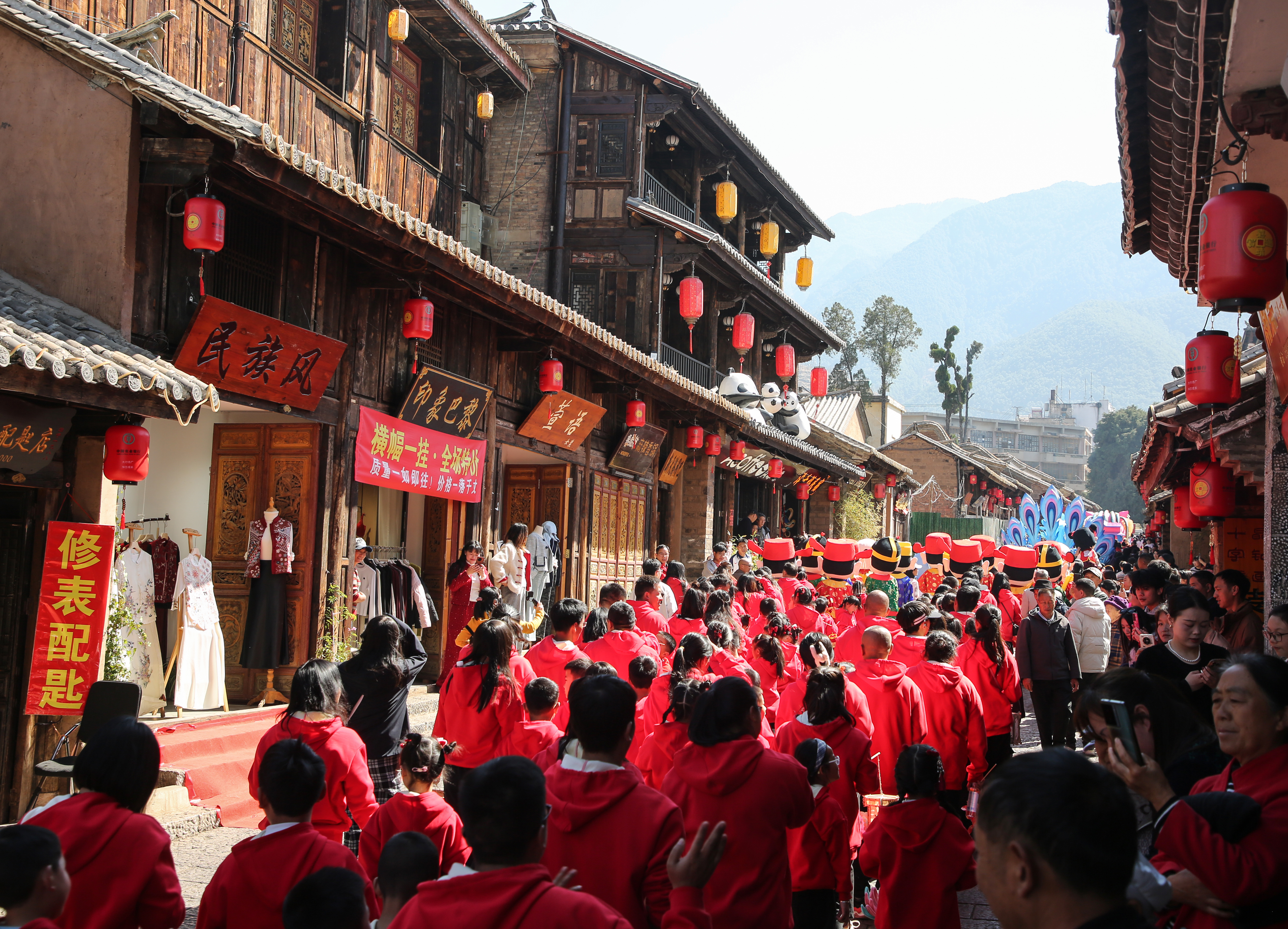 2月17日(大年初一),会泽古城被一场穿越时空的巡游唤醒。博物馆广场前,舞龙舞狮队翻腾开路,铸币队重现“钱王之乡”“钱城会泽”的辉煌历史,铜马闹春队踏出古道雄风,年画娃娃队携福而来,哪吒神话方阵搅动风云,簪花少年队衣袂飘飘,热气腾腾方队端出家乡味道。