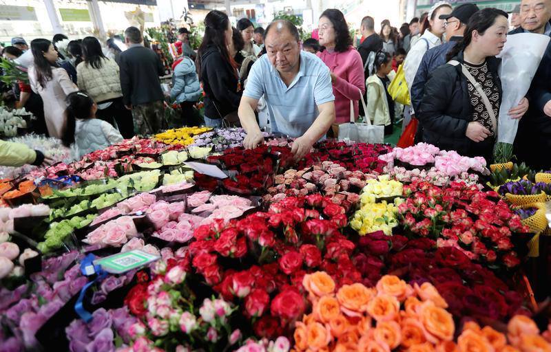 省外游客在昆明斗南花市选购鲜花,把“春天”带回家。