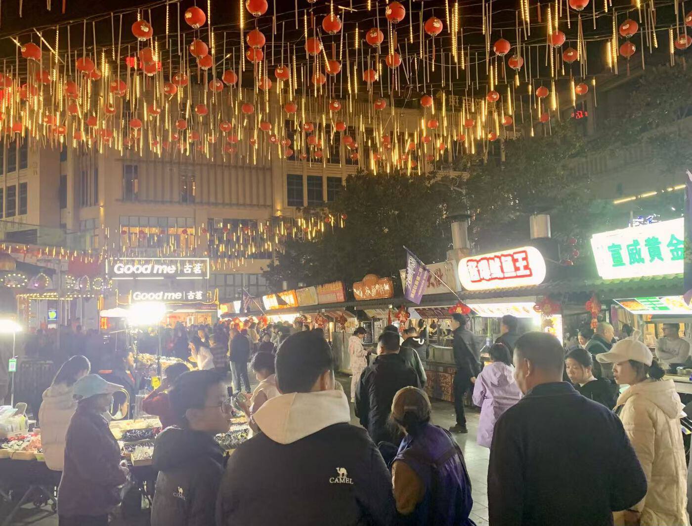 与此同时,曲靖外滩夜市同样人气高涨。街道上空挂满明艳的彩灯和喜庆的红灯笼,将整个夜市装点得绚丽多姿。道路两侧,特色美食摊位整齐排列,各类香气弥漫,吸引市民纷纷驻足品尝。