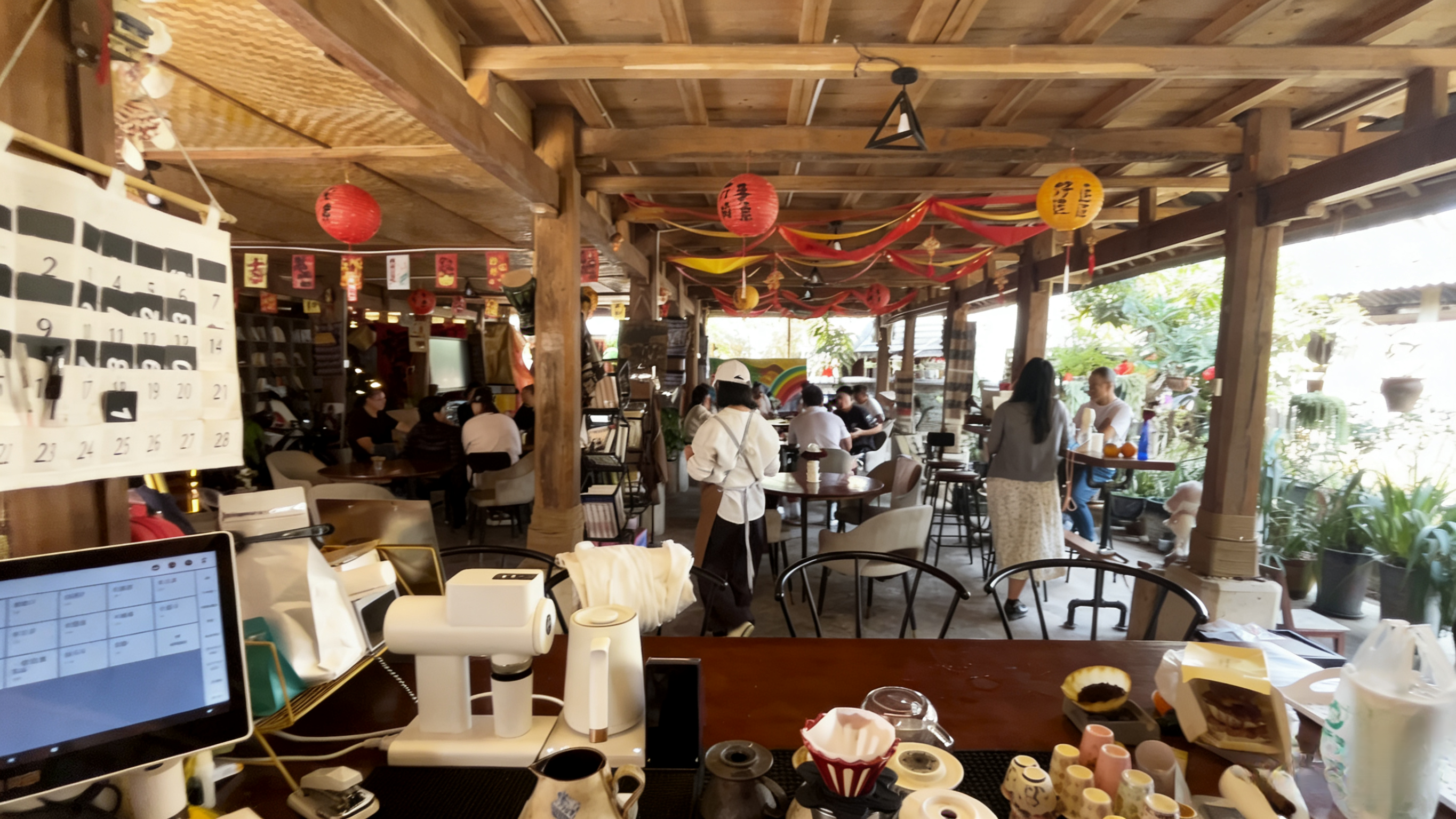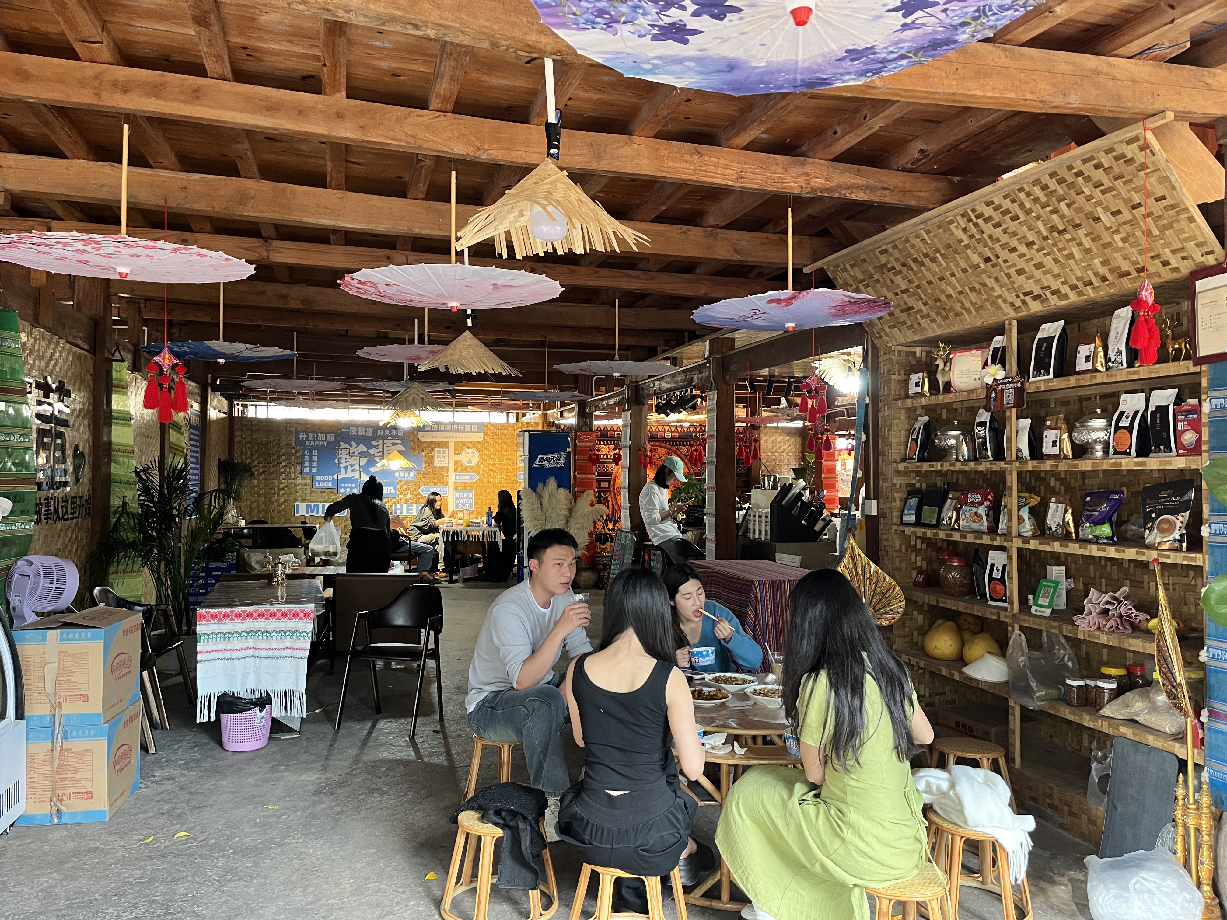 循着香气走去,家家傣味餐厅座无虚席。烤鱼在炭火上滋滋作响,舂牛干巴的木槌声此起彼伏,五彩糯米饭的清香飘满巷道。游客围坐在低矮竹桌前大快朵颐,主人家穿梭忙碌、满脸笑意。寨子深处的流光版画咖啡馆同样热闹——“90后”返乡创业青年利用传统吊脚楼改造的空间里,藤编座椅上坐满年轻人,非遗傣锦旁不时有人举起手机拍照,孩童在榕树下嬉闹的笑声传入窗来。传统与现代,在咖啡香里交融共生。