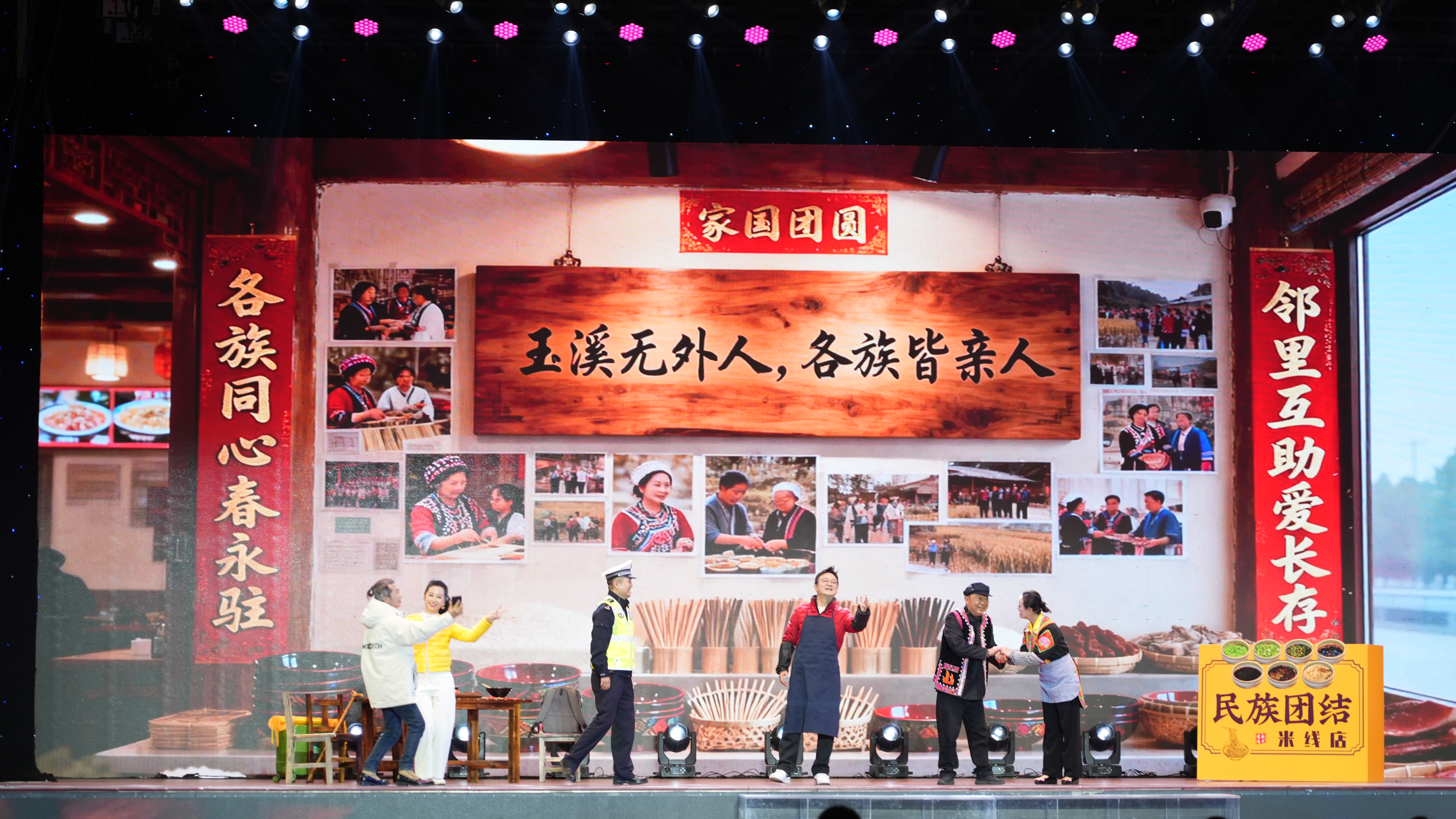 小品《米线店里的同心结》以一桌“团圆饭”暖心上演。汉族老板、彝族老板娘、哈尼族店员与蒙古族打工妹围坐一起,用各自的民族语言互道“新年快乐”。
