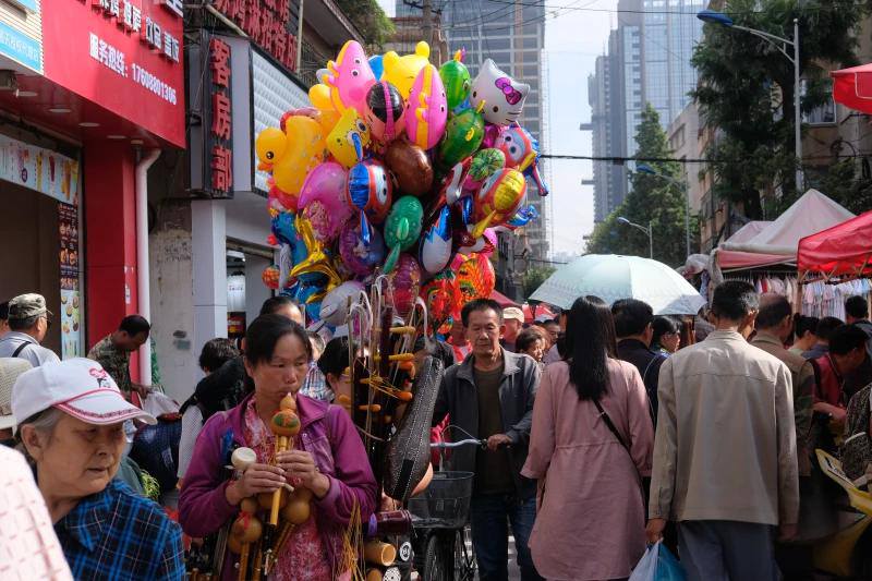 每到周日,天刚亮,马街各条街道便人头攒动,路上摊位达3000多个,市民们背着背篐、提着菜篮赶来。衣物、农副产品、滋味小吃、家禽种子一应俱全,街巷间的吆喝声、讨价还价声,成了老昆明人刻在DNA里的记忆。