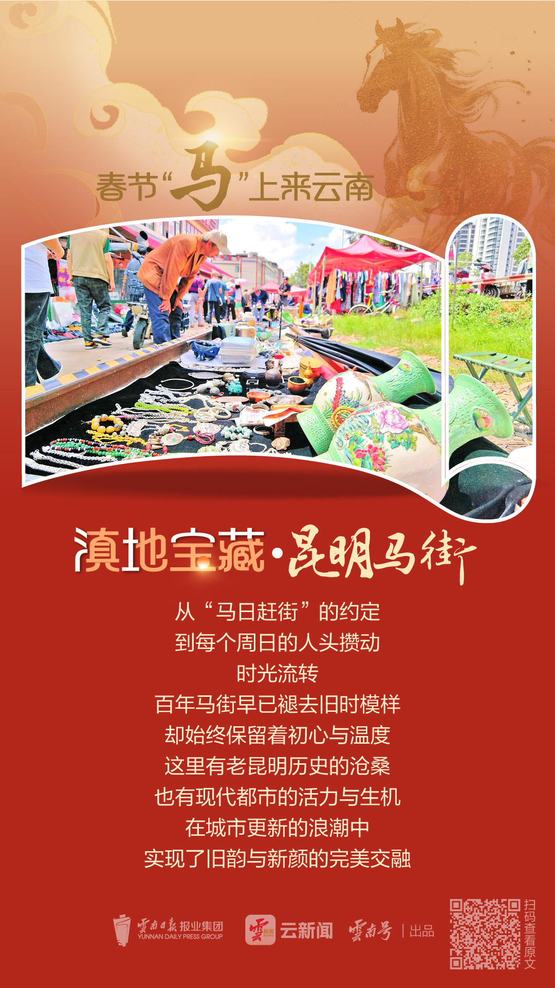 马街自古便是商贸往来的要道,马帮踏过的蹄印、商贩吆喝的声响,在岁月流转中让“马”的灵动与市集的烟火,深深融入了春城的血脉。“马”字在此,不只是生肖符号,更是坚韧、通达、生生不息的美好寄名。