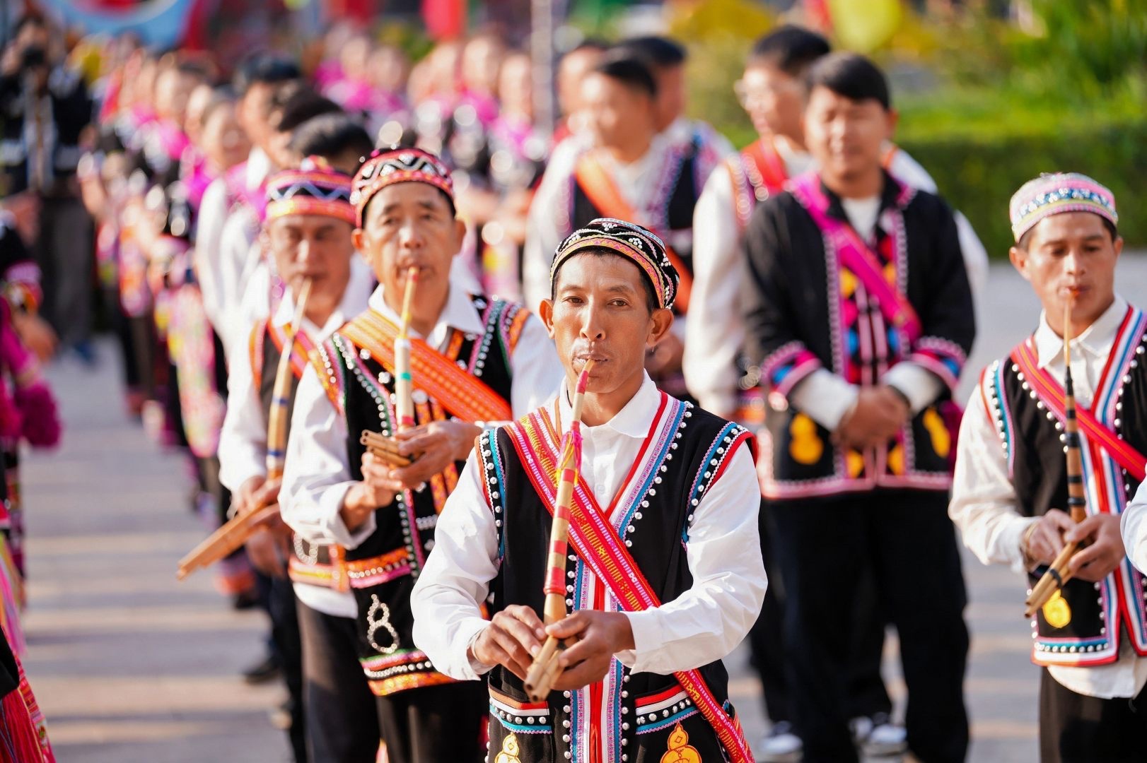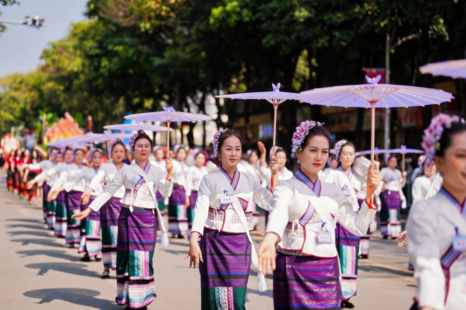 巡游队伍中,非遗展示成为了流动的风景线。国家级非物质文化遗产“拉祜族芦笙舞”方阵气势恢宏,百余名拉祜汉子手持芦笙,边吹边跳,动作粗犷有力,曲调高亢嘹亮;女子方阵则跳起了轻盈的“摆舞”,摆动手臂如风吹稻浪,展现出拉祜女性的柔美与矫健。紧随其后的是哈尼族、布朗族、傣族、佤族等民族的方阵,象脚鼓、三弦、铓锣等民族乐器轮番奏响,五彩斑斓的民族服饰在阳光下熠熠生辉,宛如一条流动的彩虹河。